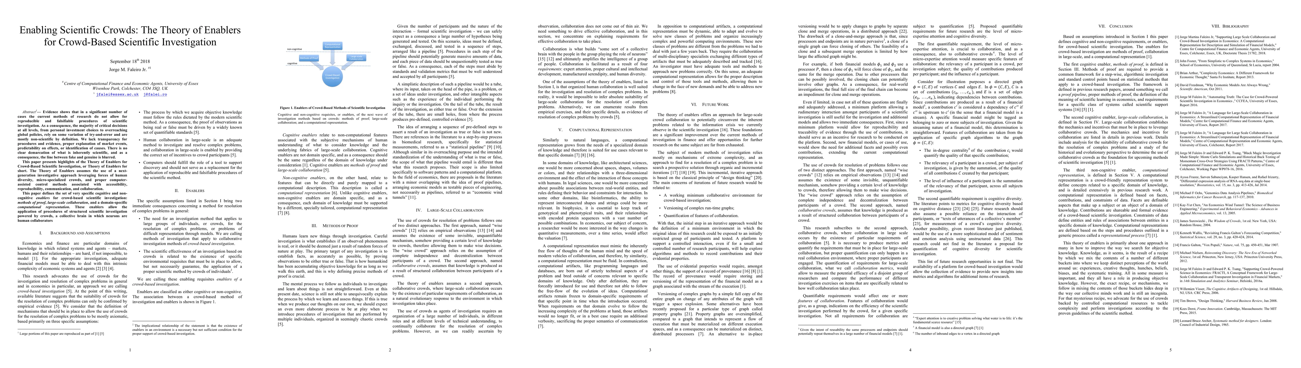 Evidence shows that in a significant number of cases the current methods of research do not allow for reproducible and falsifiable procedures of scientific investigation. As a consequence, the majority of critical decisions at all levels, from personal investment choices to overreaching global policies, rely on some variation of try-and-error and are mostly non-scientific by definition. We lack transparency for procedures and evidence, proper explanation of market events, predictability on effects, or identification of causes. There is no clear demarcation of what is inherently scientific, and as a consequence, the line between fake and genuine is blurred. This paper presents highlights of the Theory of Enablers for Crowd-Based Scientific Investigation, or Theory of Enablers for short. The Theory of Enablers assumes the use of a next-generation investigative approach leveraging forces of human diversity, micro-specialized crowds, and proper computer-assisted control methods associated with accessibility, reproducibility, communication, and collaboration. This paper defines the set of very specific cognitive and non-cognitive enablers for crowd-based scientific investigation: methods of proof, large-scale collaboration, and a domain-specific computational representation. These enablers allow the application of procedures of structured scientific investigation powered by crowds, a collective brain in which neurons are human collaborators