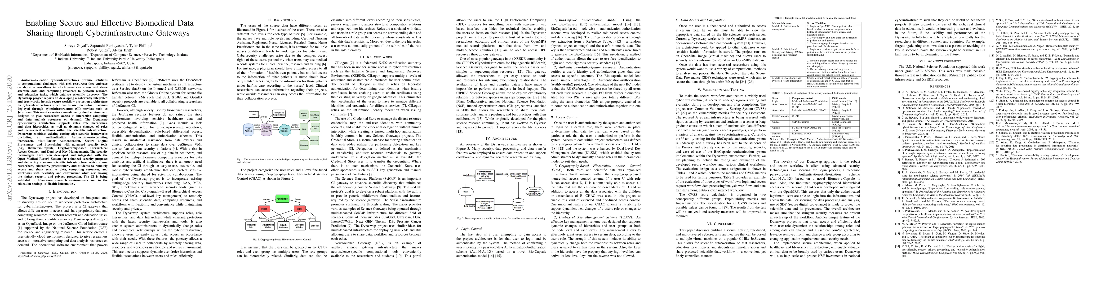 Dynaswap project reports on developing a coherently integrated and trustworthy holistic secure workflow protection architecture for cyberinfrastructures which can be used on virtual machines deployed through cyberinfrastructure (CI) services such as JetStream. This service creates a user-friendly cloud environment designed to give researchers access to interactive computing and data analysis resources on demand. The Dynaswap cybersecurity architecture supports roles, role hierarchies, and data hierarchies, as well as dynamic changes of roles and hierarchical relations within the scientific infrastructure. Dynaswap combines existing cutting-edge security frameworks (including an Authentication Authorization-Accounting framework, Multi-Factor Authentication, Secure Digital Provenance, and Blockchain) with advanced security tools (e.g., Biometric-Capsule, Cryptography-based Hierarchical Access Control, and Dual-level Key Management). The CI is being validated in life-science research environments and in the education settings of Health Informatics.