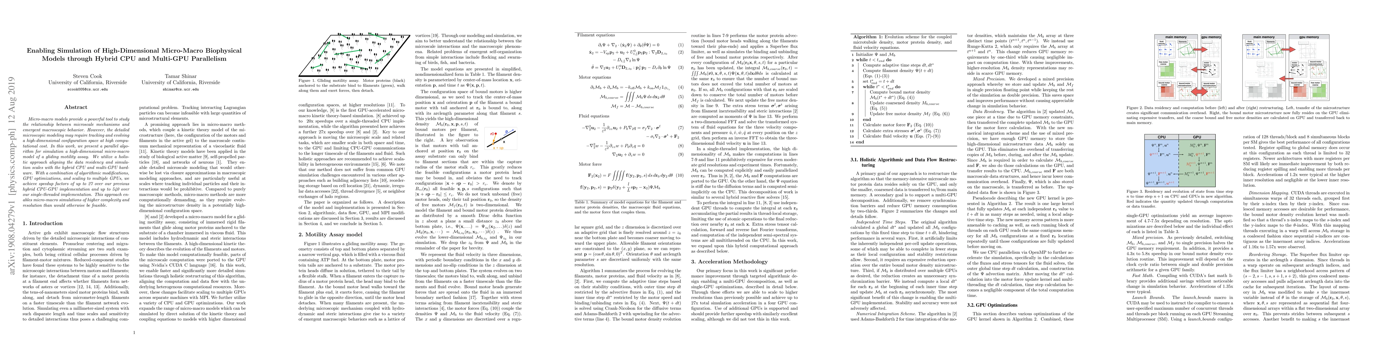 This paper presents a parallel algorithm leveraging hybrid CPU and multi-GPU parallelism to simulate high-dimensional micro-macro biophysical models, achieving significant speedup factors and enabling more complex simulations than previous methods. The approach combines algorithmic modifications, GPU optimizations, and multi-GPU scaling.