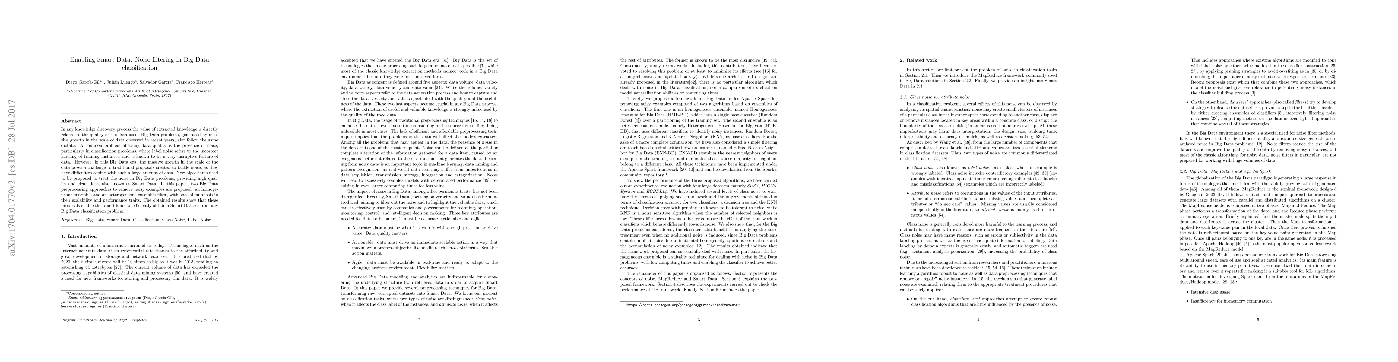 This paper proposes two Big Data preprocessing methods to eliminate noisy examples, addressing the challenge of traditional noise-tackling algorithms failing with massive data scales. The methods, an homogeneous ensemble and an heterogeneous ensemble filter, are evaluated for scalability and performance, demonstrating their effectiveness in generating 'Smart Data' for Big Data classification problems.