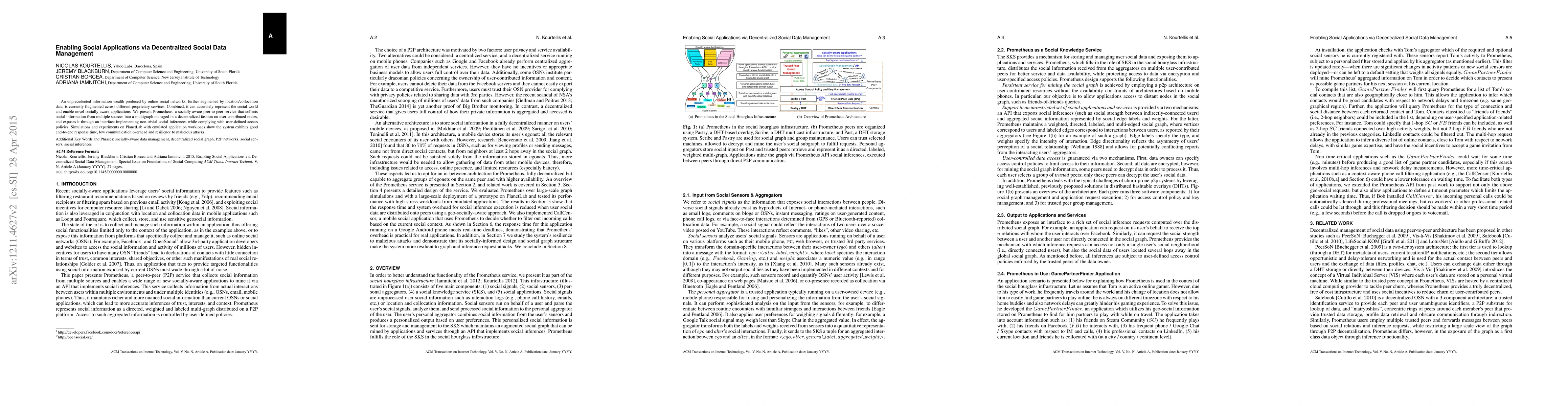 The paper introduces Prometheus, a decentralized social data management system that aggregates fragmented social data from various sources into a multigraph on user-contributed nodes, enabling socially-aware applications while adhering to user-defined access policies. Evaluations show Prometheus achieves good performance and resilience against attacks.