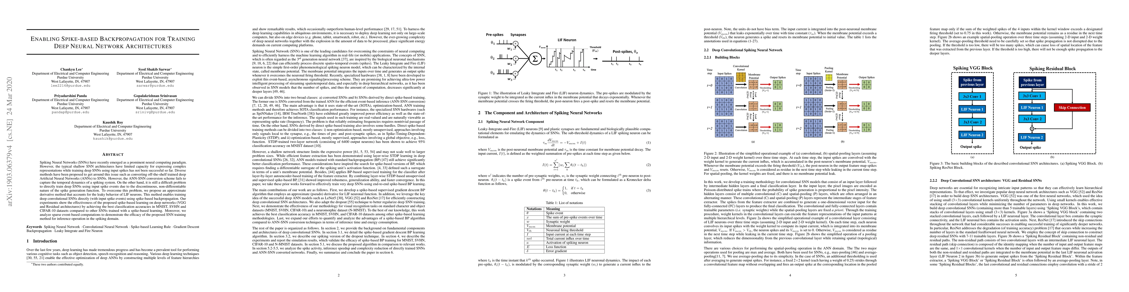 Spiking Neural Networks (SNNs) have recently emerged as a prominent neural computing paradigm. However, the typical shallow SNN architectures have limited capacity for expressing complex representations while training deep SNNs using input spikes has not been successful so far. Diverse methods have been proposed to get around this issue such as converting off-the-shelf trained deep Artificial Neural Networks (ANNs) to SNNs. However, the ANN-SNN conversion scheme fails to capture the temporal dynamics of a spiking system. On the other hand, it is still a difficult problem to directly train deep SNNs using input spike events due to the discontinuous, non-differentiable nature of the spike generation function. To overcome this problem, we propose an approximate derivative method that accounts for the leaky behavior of LIF neurons. This method enables training deep convolutional SNNs directly (with input spike events) using spike-based backpropagation. Our experiments show the effectiveness of the proposed spike-based learning on deep networks (VGG and Residual architectures) by achieving the best classification accuracies in MNIST, SVHN and CIFAR-10 datasets compared to other SNNs trained with a spike-based learning. Moreover, we analyze sparse event-based computations to demonstrate the efficacy of the proposed SNN training method for inference operation in the spiking domain.