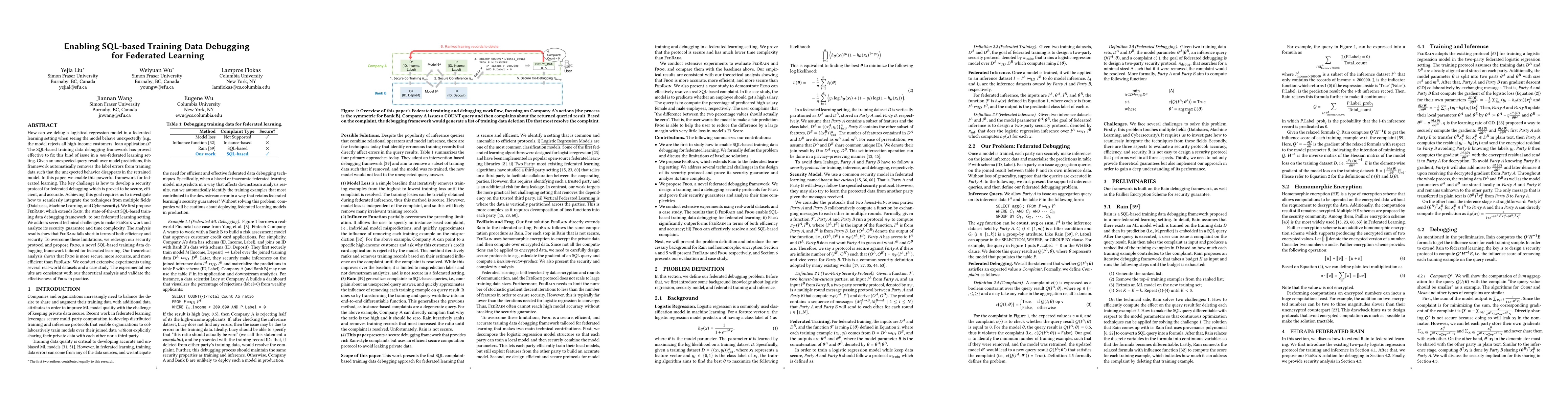 How can we debug a logistical regression model in a federated learning setting when seeing the model behave unexpectedly (e.g., the model rejects all high-income customers' loan applications)? The SQL-based training data debugging framework has proved effective to fix this kind of issue in a non-federated learning setting. Given an unexpected query result over model predictions, this framework automatically removes the label errors from training data such that the unexpected behavior disappears in the retrained model. In this paper, we enable this powerful framework for federated learning. The key challenge is how to develop a security protocol for federated debugging which is proved to be secure, efficient, and accurate. Achieving this goal requires us to investigate how to seamlessly integrate the techniques from multiple fields (Databases, Machine Learning, and Cybersecurity). We first propose FedRain, which extends Rain, the state-of-the-art SQL-based training data debugging framework, to our federated learning setting. We address several technical challenges to make FedRain work and analyze its security guarantee and time complexity. The analysis results show that FedRain falls short in terms of both efficiency and security. To overcome these limitations, we redesign our security protocol and propose Frog, a novel SQL-based training data debugging framework tailored for federated learning. Our theoretical analysis shows that Frog is more secure, more accurate, and more efficient than FedRain. We conduct extensive experiments using several real-world datasets and a case study. The experimental results are consistent with our theoretical analysis and validate the effectiveness of Frog in practice.