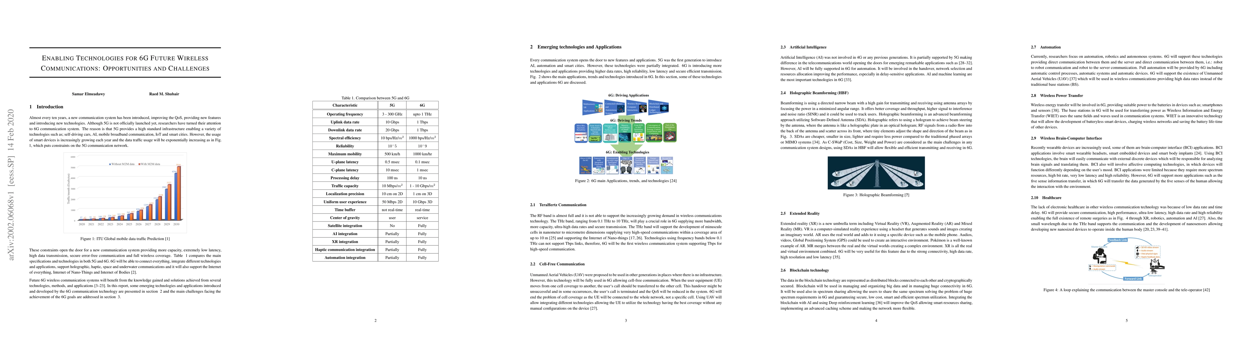 5G wireless communications technology is being launched, with many smart applications being integrated. However, 5G specifications merge the requirements of new emerging technologies forcefully. These include data rate, capacity, latency, reliability, resources sharing, and energy/bit. To meet these challenging demands, research is focusing on 6G wireless communications enabling different technologies and emerging new applications. In this report, the latest research work on 6G technologies and applications is summarized, and the associated research challenges are discussed.