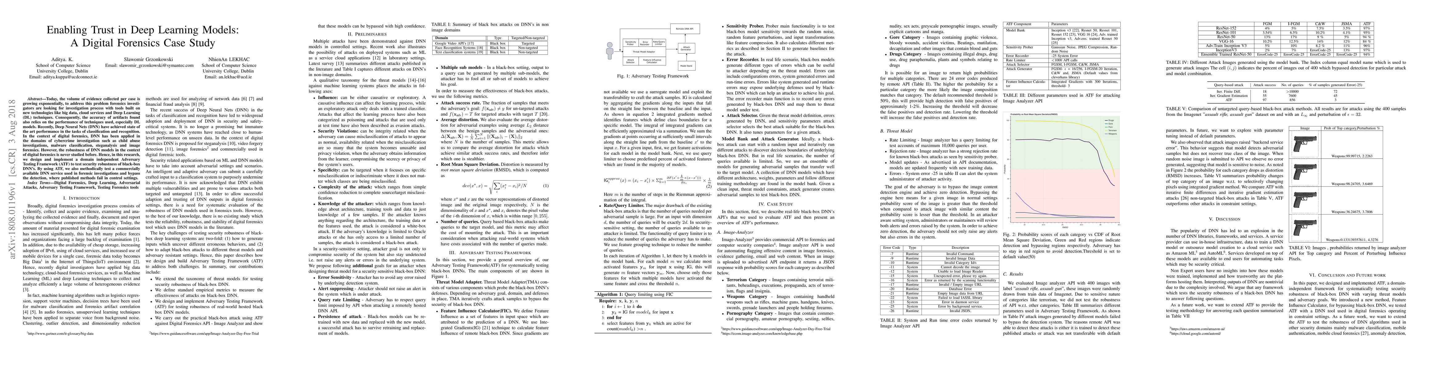 Today, the volume of evidence collected per case is growing exponentially, to address this problem forensics investigators are looking for investigation process with tools built on new technologies like big data, cloud services, and Deep Learning (DL) techniques. Consequently, the accuracy of artifacts found also relies on the performance of techniques used, especially DL models. Recently, \textbf{D}eep \textbf{N}eural \textbf{N}ets (\textbf{DNN}) have achieved state of the art performance in the tasks of classification and recognition. In the context of digital forensics, DNN has been applied to the domains of cybercrime investigation such as child abuse investigations, malware classification, steganalysis and image forensics. However, the robustness of DNN models in the context of digital forensics is never studied before. Hence, in this research, we design and implement a domain-independent Adversary Testing Framework (ATF) to test the security robustness of black-box DNN's. By using ATF, we also methodically test a commercially available DNN service used in forensic investigations and bypass the detection, where published methods fail in control settings.