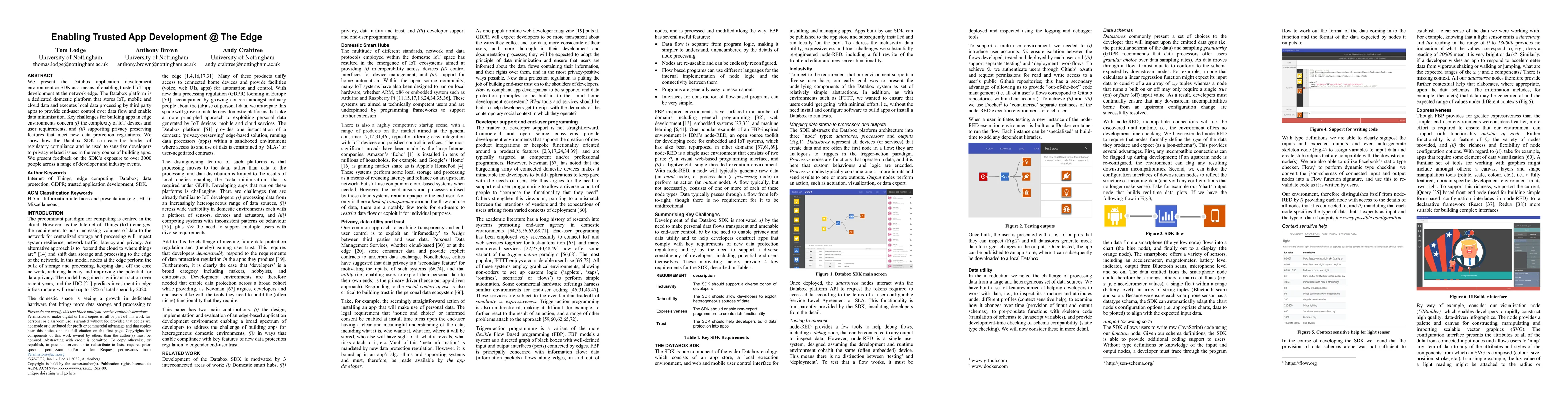 The Databox SDK facilitates trusted IoT app development at the network edge by providing a platform for local data processing and ensuring end-user control over data flow, while addressing regulatory compliance and privacy concerns. Feedback from over 3000 users highlights its effectiveness in sensitizing developers to privacy issues.