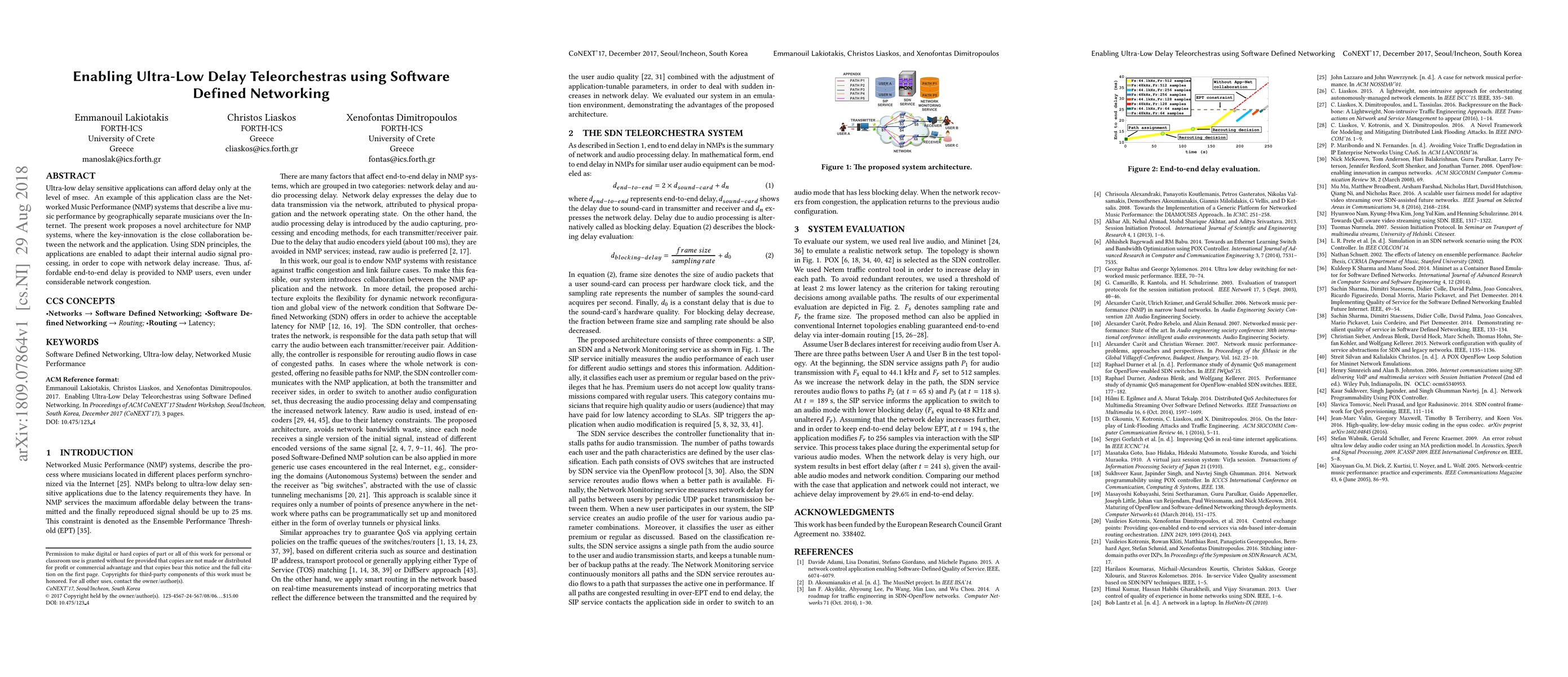 Ultra-low delay sensitive applications can afford delay only at the level of msec. An example of this application class are the Networked Music Performance (NMP) systems that describe a live music performance by geographically separate musicians over the Internet. The present work proposes a novel architecture for NMP systems, where the key-innovation is the close collaboration between the network and the application. Using SDN principles, the applications are enabled to adapt their internal audio signal processing, in order to cope with network delay increase. Thus, affordable end-to-end delay is provided to NMP users, even under considerable network congestion.