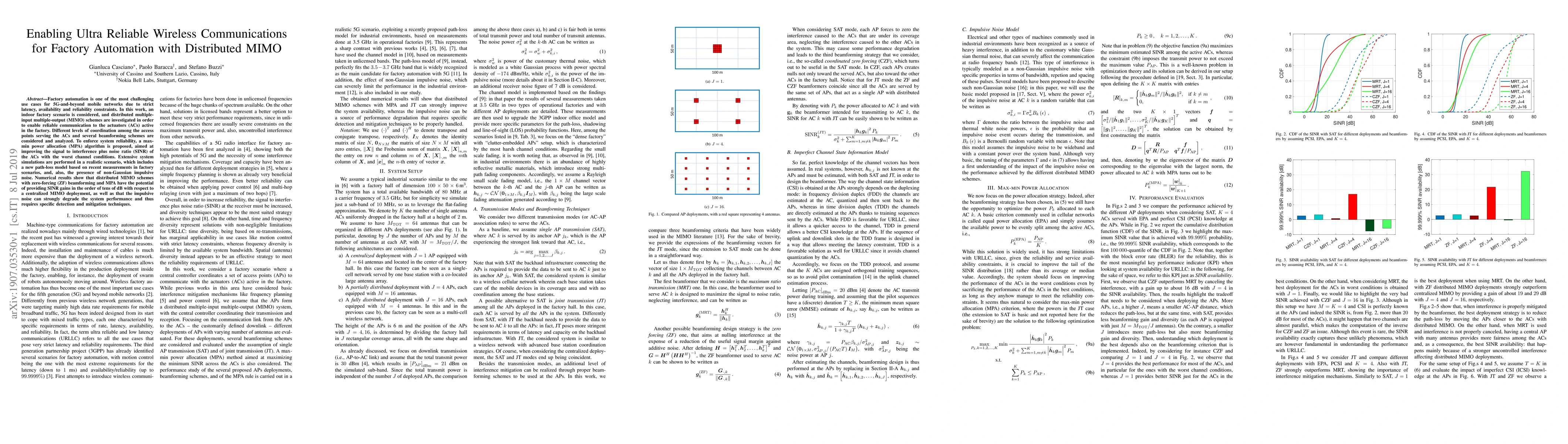 This research paper explores using distributed MIMO schemes to enable ultra-reliable wireless communications in factory automation networks, achieving significant gains over centralized deployments, while also addressing the impact of non-Gaussian impulsive noise on system performance.