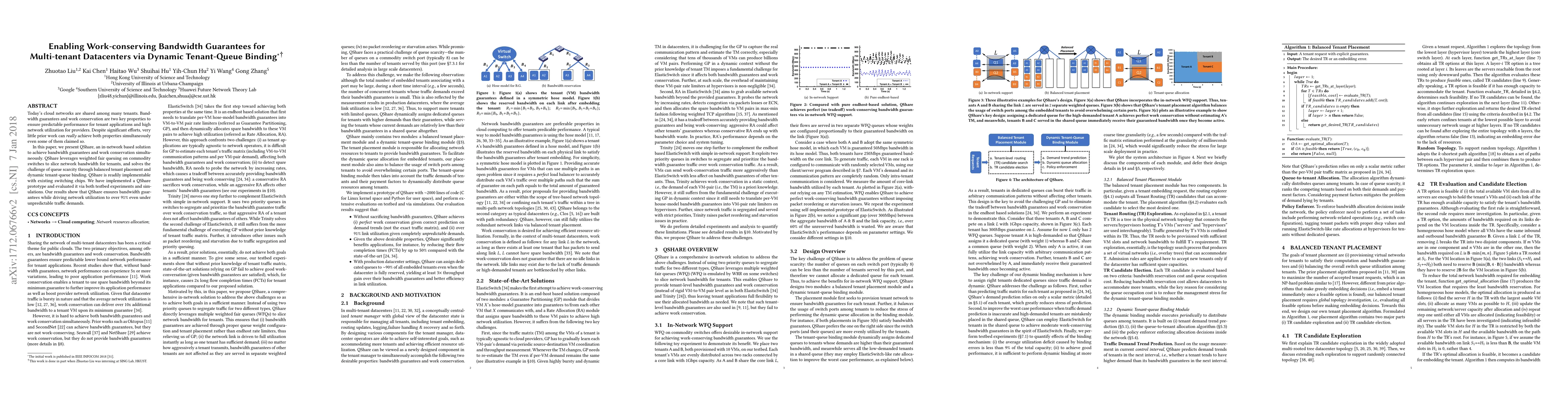 This paper introduces QShare, an in-network solution for multi-tenant datacenters that ensures both bandwidth guarantees and work conservation. It employs weighted fair queuing and dynamic tenant-queue binding to optimize network performance and utilization, achieving over 91% utilization while maintaining guarantees.