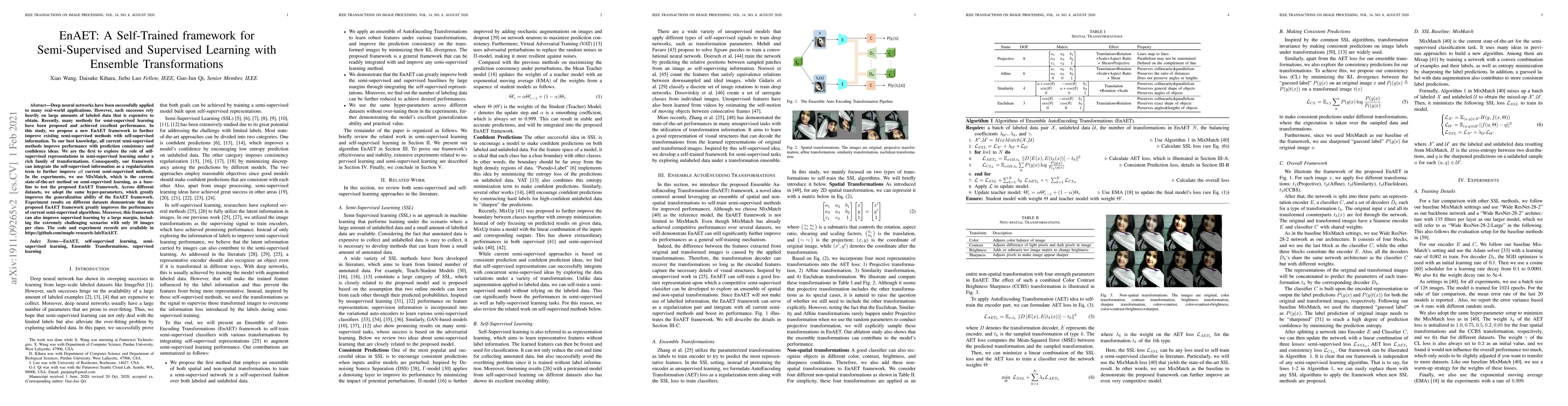 The EnAET framework introduces self-supervised representations to enhance both semi-supervised and supervised learning, significantly improving performance across various datasets and even in scenarios with minimal labeled data. The proposed method integrates self-supervised information as a regularization term, outperforming state-of-the-art semi-supervised learning methods.