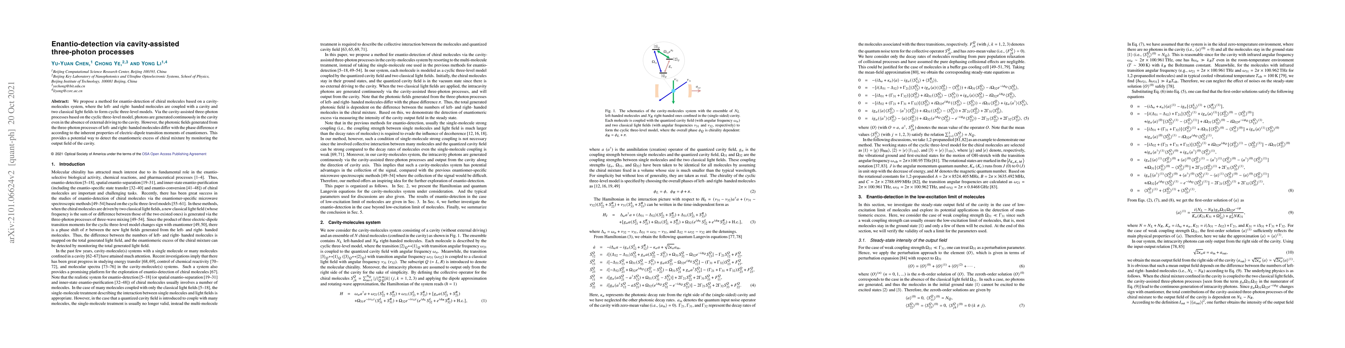 Researchers propose a method to detect chiral molecules using a cavity-assisted three-photon process that can distinguish between left- and right-handed molecules based on their phase difference, enabling enantio-detection.
