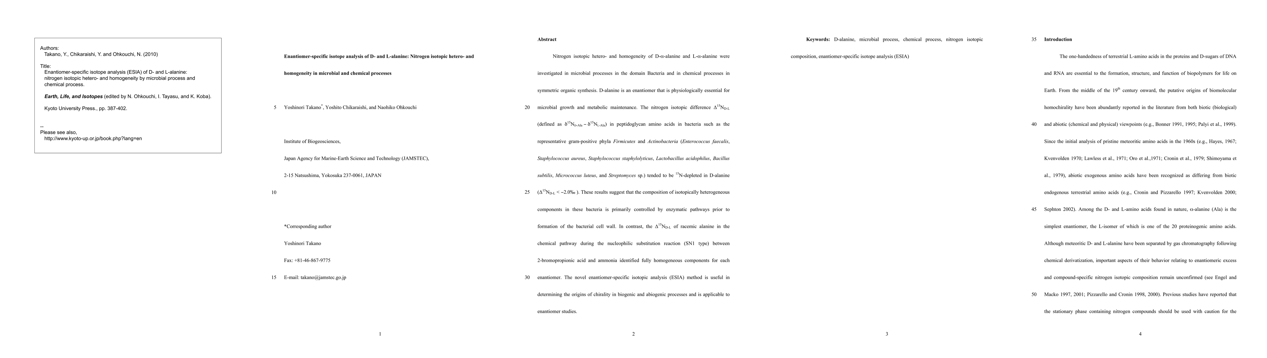 Nitrogen isotopic hetero- and homogeneity of D-{\alpha}-alanine and L-{\alpha}-alanine were investigated in microbial processes in the domain Bacteria and in chemical processes in symmetric organic synthesis. D-alanine is an enantiomer that is physiologically essential for microbial growth and metabolic maintenance. The nitrogen isotopic difference {\Delta}15ND-L (defined as {\delta}15ND-Ala - {\delta}15NL-Ala) in peptidoglycan amino acids in bacteria such as the representative gram-positive phyla Firmicutes and Actinobacteria (Enterococcus faecalis, Staphylococcus aureus, Staphylococcus staphylolyticus, Lactobacillus acidophilus, Bacillus subtilis, Micrococcus luteus, and Streptomyces sp.) tended to be 15N-depleted in D-alanine ({\Delta}15ND-L < -2.0 permil). These results suggest that the composition of isotopically heterogeneous components in these bacteria is primarily controlled by enzymatic pathways prior to formation of the bacterial cell wall. In contrast, the {\Delta}15ND-L of racemic alanine in the chemical pathway during the nucleophilic substitution reaction (SN1 type) between 2-bromopropionic acid and ammonia identified fully homogeneous components for each enantiomer. The novel enantiomer-specific isotopic analysis (ESIA) method is useful in determining the origins of chirality in biogenic and abiogenic processes and is applicable to enantiomer studies. -- Keywords: D-alanine, microbial process, chemical process, nitrogen isotopic composition, enantiomer-specific isotope analysis (ESIA)