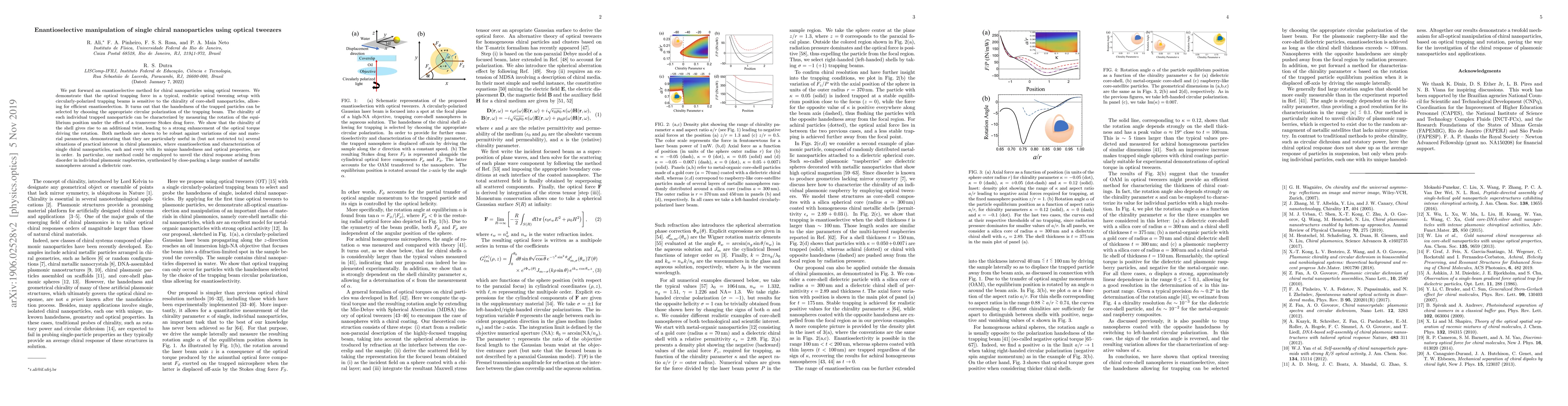 This paper presents an enantioselective method for manipulating chiral nanoparticles using optical tweezers, demonstrating that the optical trapping force is sensitive to the chirality of core-shell nanoparticles. The handedness of trapped particles can be selected via the circular polarization of the trapping beam, and the chirality can be characterized by measuring the rotation induced by the transverse Stokes drag force.
