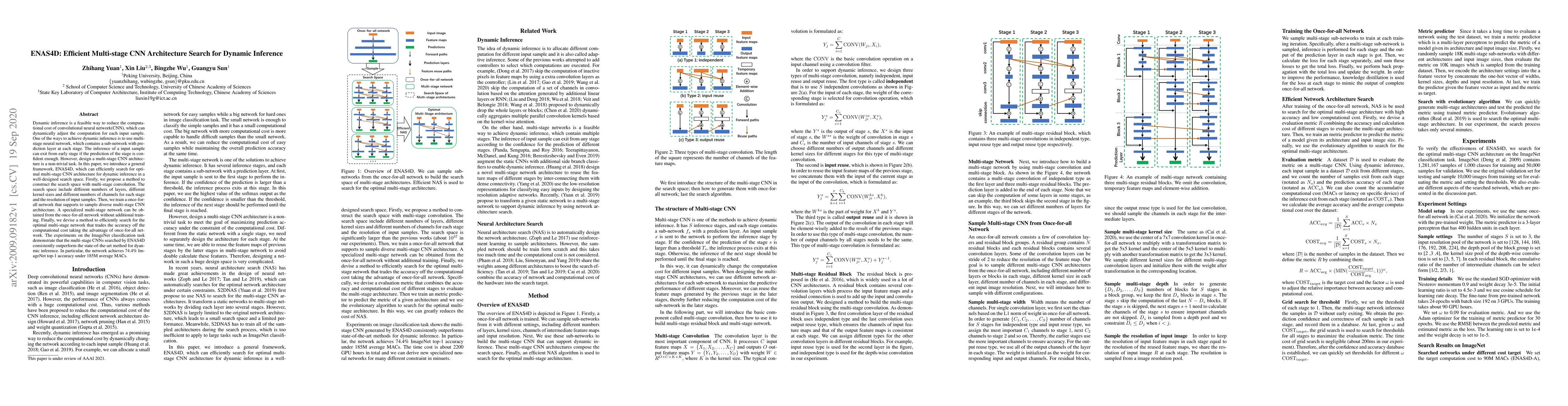 Dynamic inference is a feasible way to reduce the computational cost of convolutional neural network(CNN), which can dynamically adjust the computation for each input sample. One of the ways to achieve dynamic inference is to use multi-stage neural network, which contains a sub-network with prediction layer at each stage. The inference of a input sample can exit from early stage if the prediction of the stage is confident enough. However, design a multi-stage CNN architecture is a non-trivial task. In this paper, we introduce a general framework, ENAS4D, which can efficiently search for optimal multi-stage CNN architecture for dynamic inference in a well-designed search space. Firstly, we propose a method to construct the search space with multi-stage convolution. The search space include different numbers of layers, different kernel sizes and different numbers of channels for each stage and the resolution of input samples. Then, we train a once-for-all network that supports to sample diverse multi-stage CNN architecture. A specialized multi-stage network can be obtained from the once-for-all network without additional training. Finally, we devise a method to efficiently search for the optimal multi-stage network that trades the accuracy off the computational cost taking the advantage of once-for-all network. The experiments on the ImageNet classification task demonstrate that the multi-stage CNNs searched by ENAS4D consistently outperform the state-of-the-art method for dyanmic inference. In particular, the network achieves 74.4% ImageNet top-1 accuracy under 185M average MACs.
