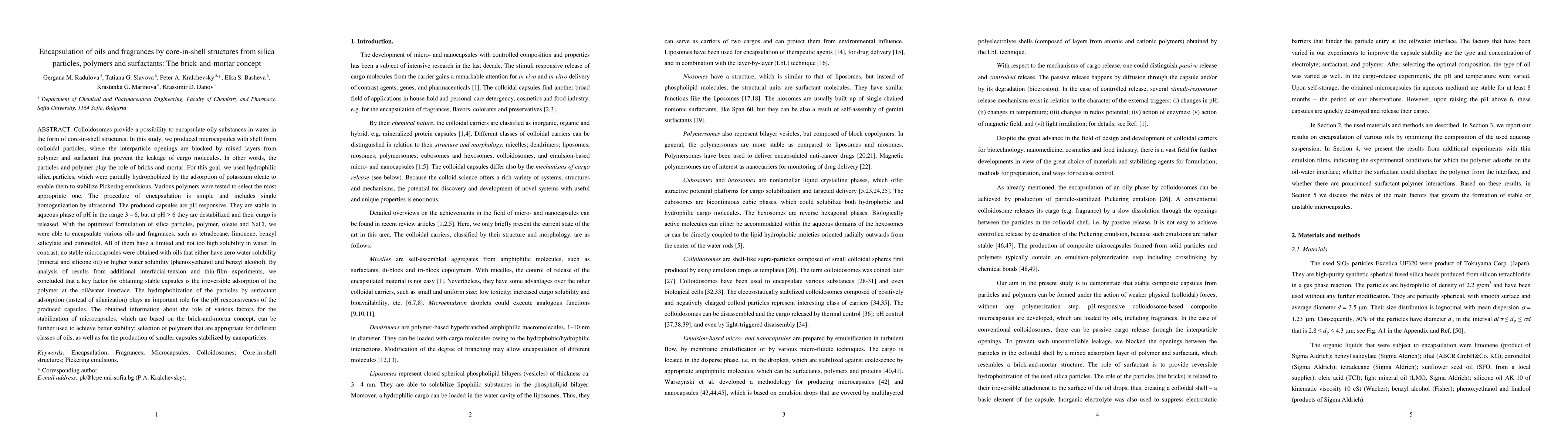 This study developed core-in-shell microcapsules using silica particles and polymers to encapsulate oils and fragrances, achieving pH-responsive stability. The capsules are stable at pH 3-6 but release cargo at pH>6, and successfully encapsulate oils like tetradecane and limonene.