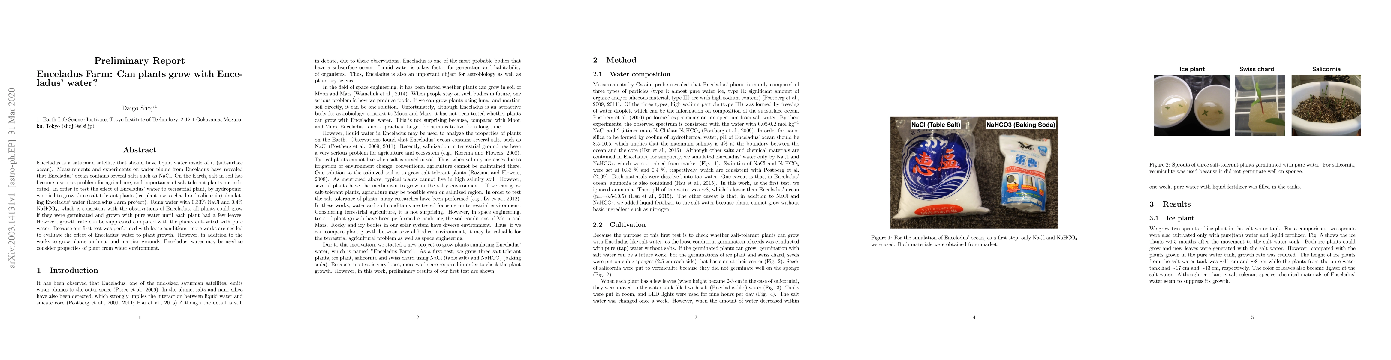 This preliminary report investigates whether terrestrial salt-tolerant plants can grow in simulated Enceladus water, finding that while germination and initial growth are possible, growth rates are suppressed compared to pure water. Further studies are needed to fully understand the impact of Enceladus' saline environment on plant development.