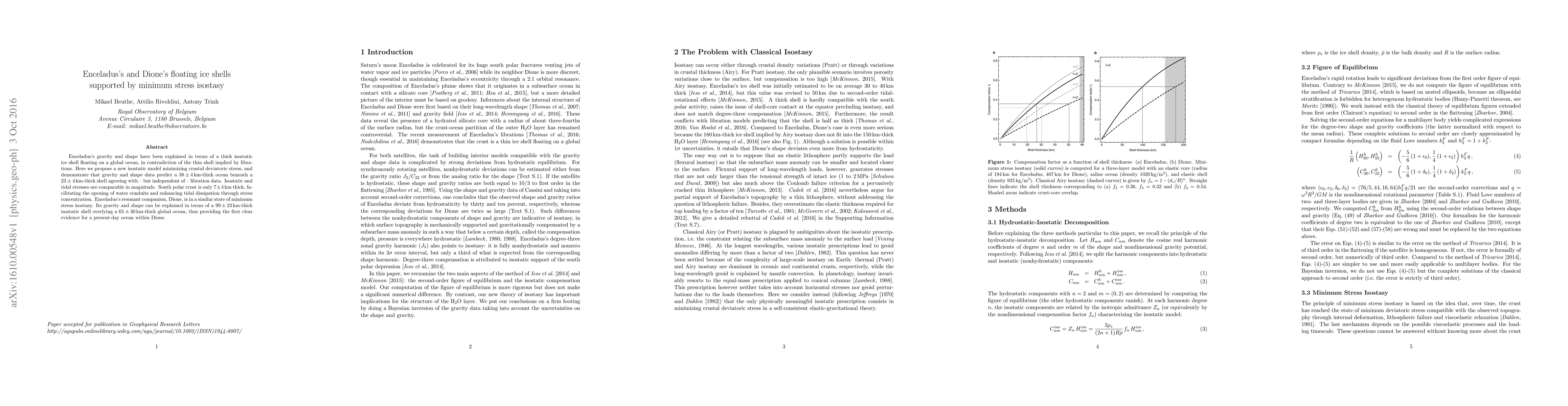 Enceladus's gravity and shape have been explained in terms of a thick isostatic ice shell floating on a global ocean, in contradiction of the thin shell implied by librations. Here we propose a new isostatic model minimizing crustal deviatoric stress, and demonstrate that gravity and shape data predict a $\rm{38\pm4\,km}$-thick ocean beneath a $\rm{23\pm4\,km}$-thick shell agreeing with -- but independent of -- libration data. Isostatic and tidal stresses are comparable in magnitude. South polar crust is only $7\pm4\rm\,km$ thick, facilitating the opening of water conduits and enhancing tidal dissipation through stress concentration. Enceladus's resonant companion, Dione, is in a similar state of minimum stress isostasy. Its gravity and shape can be explained in terms of a $\rm{99\pm23\,km}$-thick isostatic shell overlying a $\rm{65\pm30\,km}$-thick global ocean, thus providing the first clear evidence for a present-day ocean within Dione.