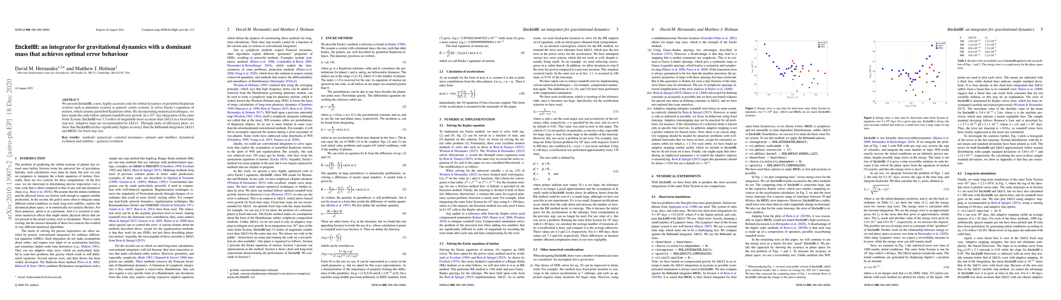 We present EnckeHH, a new, highly accurate code for orbital dynamics of perturbed Keplerian systems such as planetary systems or galactic centre systems. It solves Encke's equations of motion, which assume perturbed Keplerian orbits. By incorporating numerical techniques, we have made the code follow optimal roundoff error growth. In a $10^ {12}$ day integration of the outer Solar System, EnckeHH was $3.5$ orders of magnitude more accurate than IAS15 in a fixed time step test. Adaptive steps are recommended for IAS15. Through study of efficiency plots, we show that EnckeHH reaches significantly higher accuracy than the Rebound integrators IAS15 and WHCKL for fixed step size.