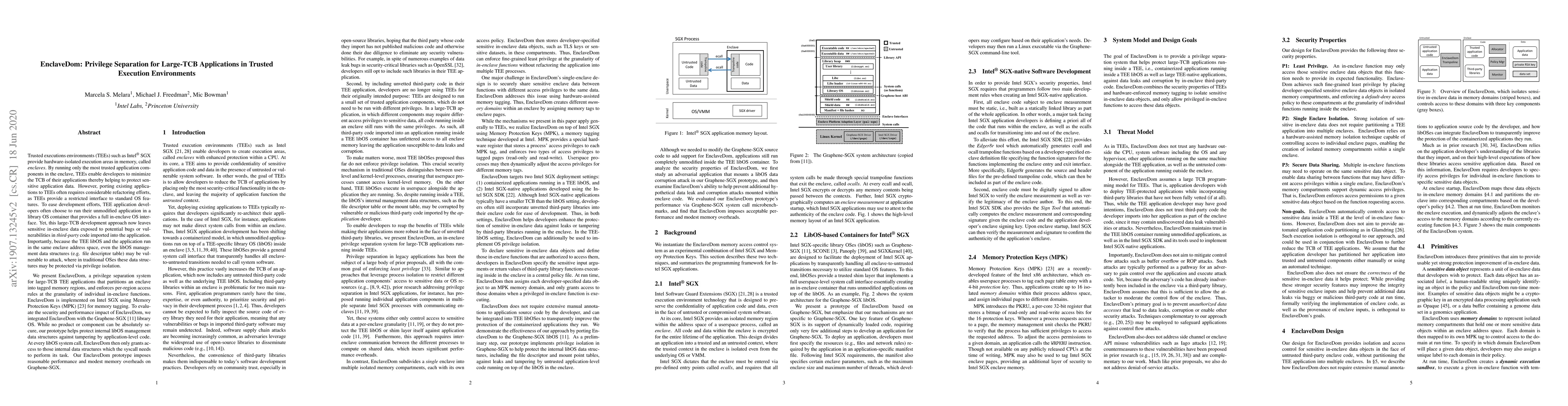 EnclaveDom introduces a privilege separation mechanism for large-TCB applications in TEEs, partitioning enclaves into tagged memory regions and enforcing per-region access rules using Intel SGX's Memory Protection Keys. This system aims to protect libOS management data from application-level code, enhancing security without requiring extensive application refactoring.