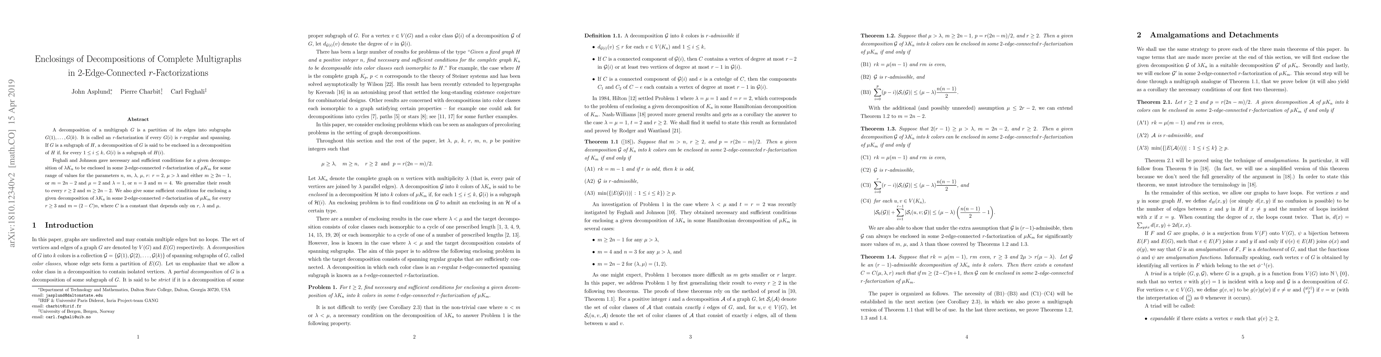 A decomposition of a multigraph $G$ is a partition of its edges into subgraphs $G(1), \ldots , G(k)$. It is called an $r$-factorization if every $G(i)$ is $r$-regular and spanning. If $G$ is a subgraph of $H$, a decomposition of $G$ is said to be enclosed in a decomposition of $H$ if, for every $1 \leq i \leq k$, $G(i)$ is a subgraph of $H(i)$. Feghali and Johnson gave necessary and sufficient conditions for a given decomposition of $\lambda K_n$ to be enclosed in some $2$-edge-connected $r$-factorization of $\mu K_{m}$ for some range of values for the parameters $n$, $m$, $\lambda$, $\mu$, $r$: $r=2$, $\mu>\lambda$ and either $m \geq 2n-1$, or $m=2n-2$ and $\mu = 2$ and $\lambda=1$, or $n=3$ and $m=4$. We generalize their result to every $r \geq 2$ and $m \geq 2n - 2$. We also give some sufficient conditions for enclosing a given decomposition of $\lambda K_n$ in some $2$-edge-connected $r$-factorization of $\mu K_{m}$ for every $r \geq 3$ and $m = (2 - C)n$, where $C$ is a constant that depends only on $r$, $\lambda$ and~$\mu$.