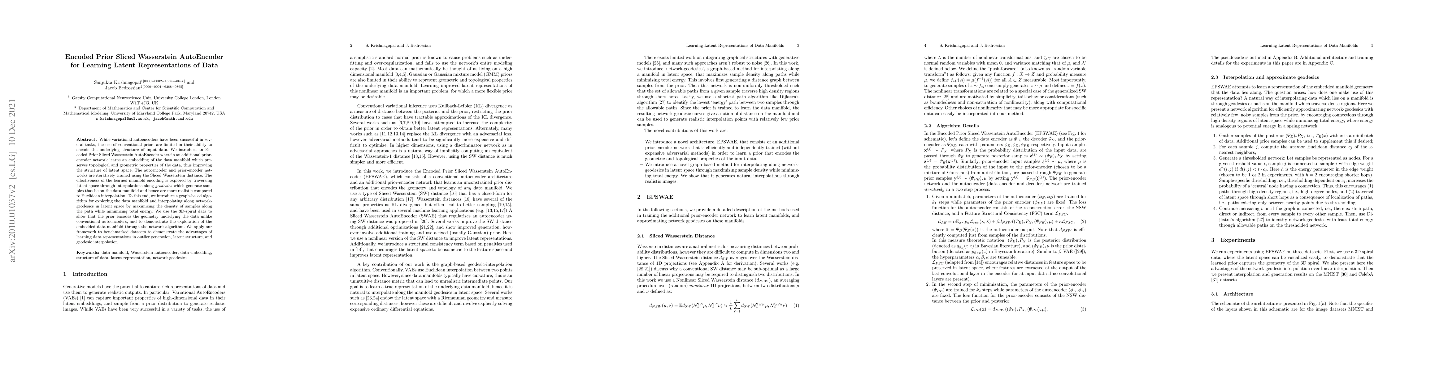 This paper proposes an Encoded Prior Sliced Wasserstein AutoEncoder to enhance the latent structure of variational autoencoders by incorporating a prior-encoder network that learns data manifold embeddings. The autoencoder and prior-encoder networks are trained using the Sliced Wasserstein distance, and the method is demonstrated to generate more realistic samples through geodesic interpolations in latent space.