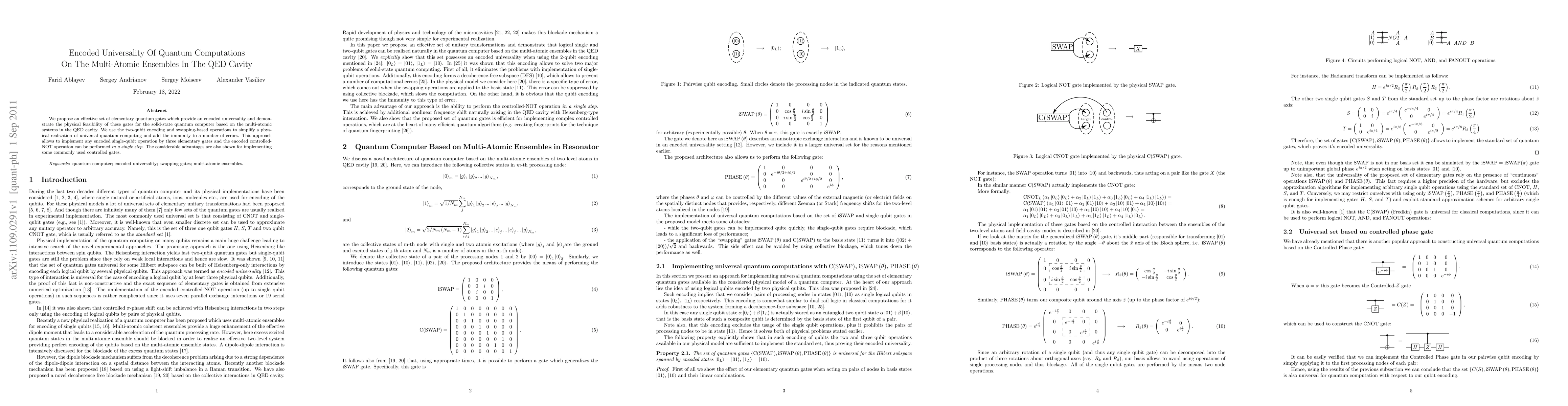 We propose an effective set of elementary quantum gates which provide an encoded universality and demonstrate the physical feasibility of these gates for the solid-state quantum computer based on the multi-atomic systems in the QED cavity. We use the two-qubit encoding and swapping-based operations to simplify a physical realization of universal quantum computing and add the immunity to a number of errors. This approach allows to implement any encoded single-qubit operation by three elementary gates and the encoded controlled- NOT operation can be performed in a single step. The considerable advantages are also shown for implementing some commonly used controlled gates.