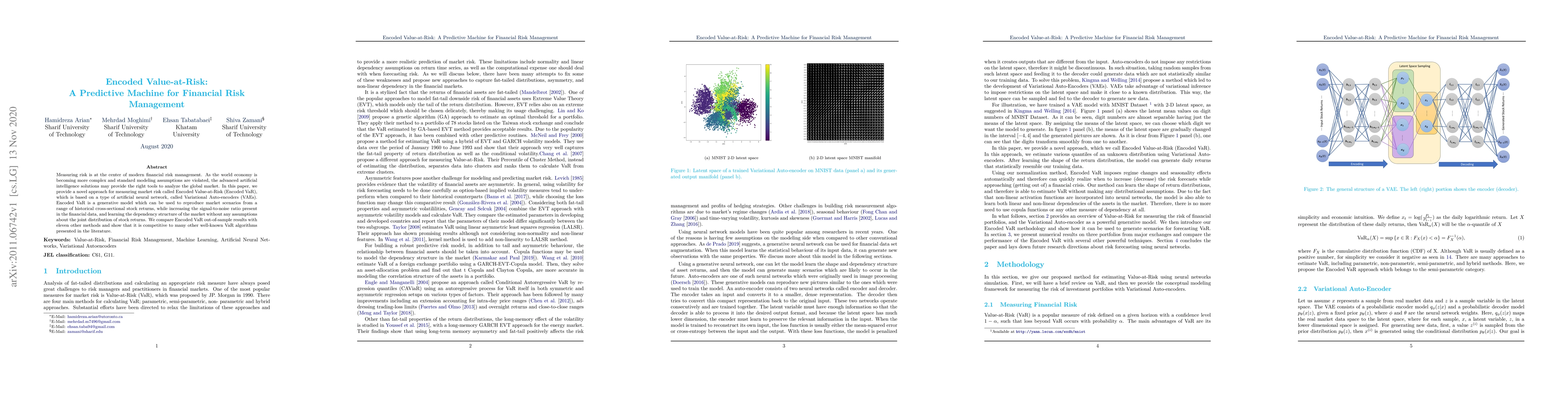 Measuring risk is at the center of modern financial risk management. As the world economy is becoming more complex and standard modeling assumptions are violated, the advanced artificial intelligence solutions may provide the right tools to analyze the global market. In this paper, we provide a novel approach for measuring market risk called Encoded Value-at-Risk (Encoded VaR), which is based on a type of artificial neural network, called Variational Auto-encoders (VAEs). Encoded VaR is a generative model which can be used to reproduce market scenarios from a range of historical cross-sectional stock returns, while increasing the signal-to-noise ratio present in the financial data, and learning the dependency structure of the market without any assumptions about the joint distribution of stock returns. We compare Encoded VaR out-of-sample results with eleven other methods and show that it is competitive to many other well-known VaR algorithms presented in the literature.