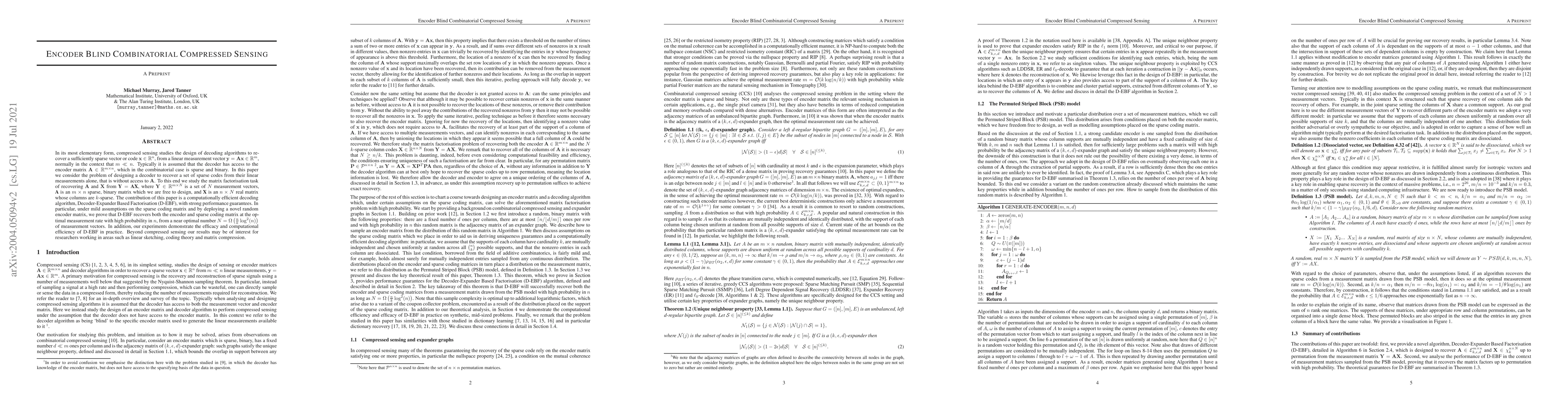 In its most elementary form, compressed sensing studies the design of decoding algorithms to recover a sufficiently sparse vector or code from a lower dimensional linear measurement vector. Typically it is assumed that the decoder has access to the encoder matrix, which in the combinatorial case is sparse and binary. In this paper we consider the problem of designing a decoder to recover a set of sparse codes from their linear measurements alone, that is without access to encoder matrix. To this end we study the matrix factorisation task of recovering both the encoder and sparse coding matrices from the associated linear measurement matrix. The contribution of this paper is a computationally efficient decoding algorithm, Decoder-Expander Based Factorisation, with strong performance guarantees. In particular, under mild assumptions on the sparse coding matrix and by deploying a novel random encoder matrix, we prove that Decoder-Expander Based Factorisation recovers both the encoder and sparse coding matrix at the optimal measurement rate with high probability and from a near optimal number of measurement vectors. In addition, our experiments demonstrate the efficacy and computational efficiency of our algorithm in practice. Beyond compressed sensing our results may be of interest for researchers working in areas such as linear sketching, coding theory and matrix compression.