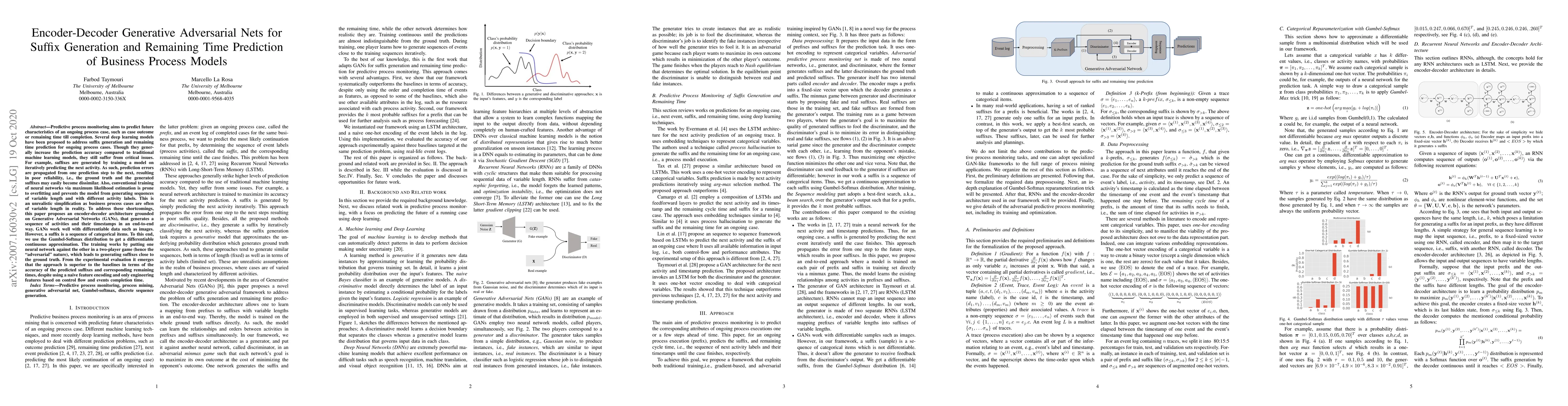 This paper introduces an encoder-decoder GAN model for generating business process model suffixes and predicting remaining times, using a differentiable Gumbel-Softmax approximation. The adversarial training improves accuracy, outperforming baselines despite simple feature engineering.