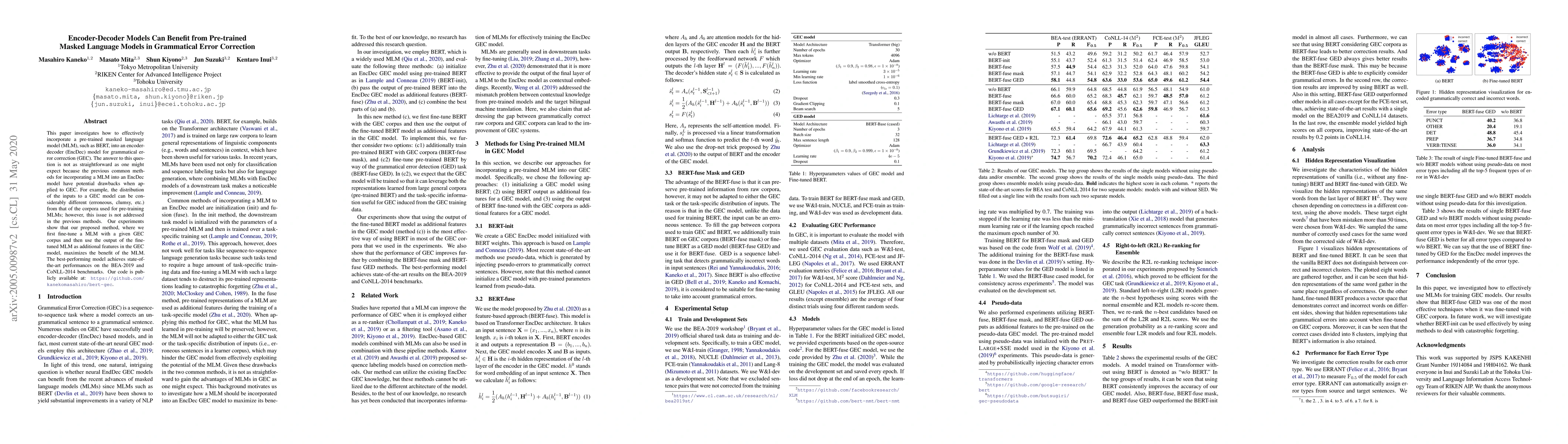 The paper investigates incorporating a pre-trained masked language model (MLM) like BERT into an encoder-decoder (EncDec) model for grammatical error correction (GEC). Three methods are evaluated: initializing an EncDec GEC model with pre-trained BERT (BERT-init), passing the output of pre-trained BERT as additional features (BERT-fuse), and combining the best parts of (a) and (b) by fine-tuning BERT with GEC corpora and using its output as additional features (method c).