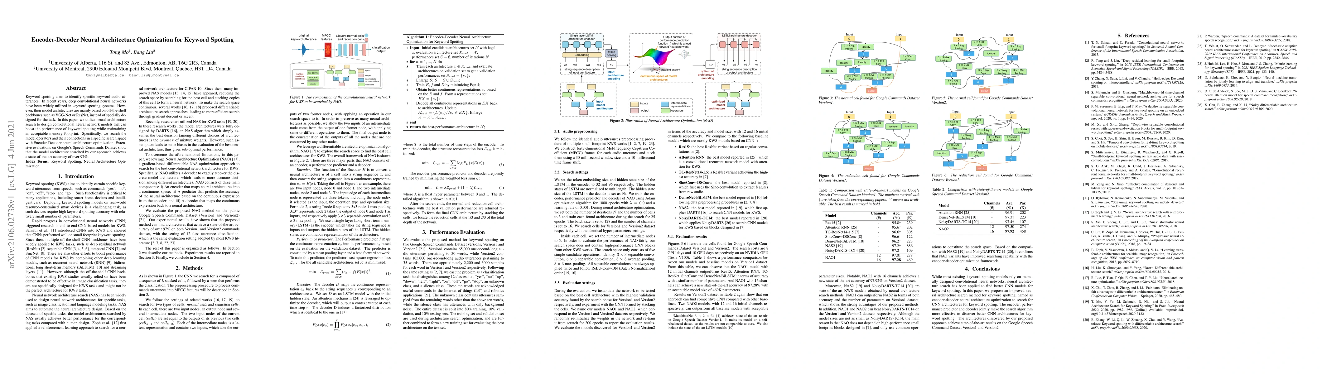 This paper optimizes encoder-decoder neural architectures using neural architecture search to improve keyword spotting accuracy. The proposed method achieves state-of-the-art performance with over 97% accuracy on Google's Speech Commands Dataset while maintaining efficient memory usage.