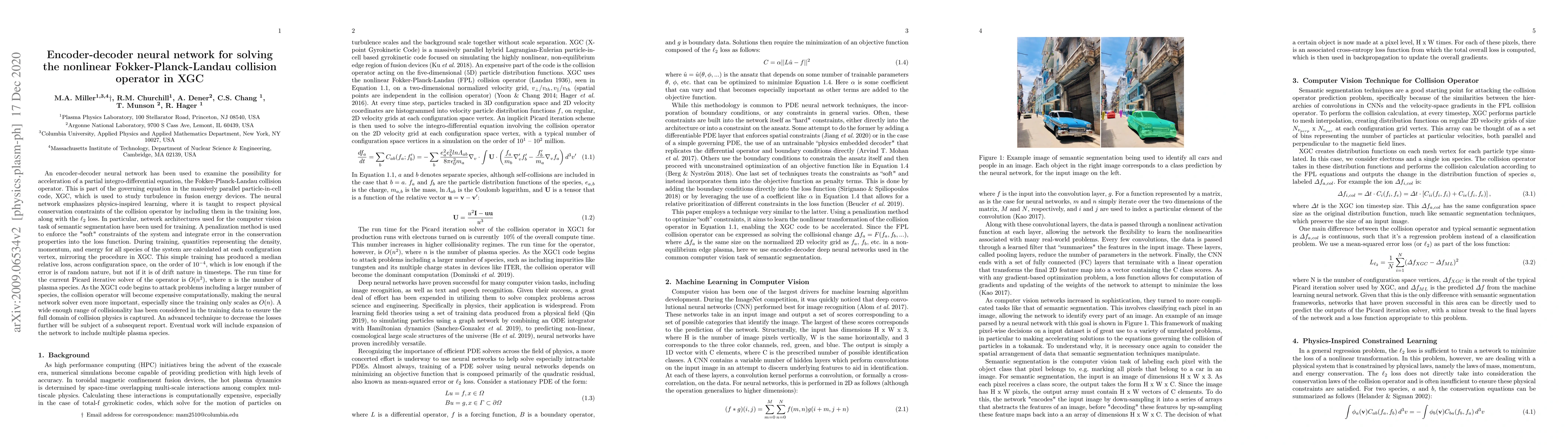 An encoder-decoder neural network has been used to examine the possibility for acceleration of a partial integro-differential equation, the Fokker-Planck-Landau collision operator. This is part of the governing equation in the massively parallel particle-in-cell code, XGC, which is used to study turbulence in fusion energy devices. The neural network emphasizes physics-inspired learning, where it is taught to respect physical conservation constraints of the collision operator by including them in the training loss, along with the L2 loss. In particular, network architectures used for the computer vision task of semantic segmentation have been used for training. A penalization method is used to enforce the "soft" constraints of the system and integrate error in the conservation properties into the loss function. During training, quantities representing the density, momentum, and energy for all species of the system is calculated at each configuration vertex, mirroring the procedure in XGC. This simple training has produced a median relative loss, across configuration space, on the order of 10E-04, which is low enough if the error is of random nature, but not if it is of drift nature in timesteps. The run time for the Picard iterative solver of the operator scales as order n squared, where n is the number of plasma species. As the XGC1 code begins to attack problems including a larger number of species, the collision operator will become expensive computationally, making the neural network solver even more important, since the training only scales as n. A wide enough range of collisionality is considered in the training data to ensure the full domain of collision physics is captured. An advanced technique to decrease the losses further will be discussed, which will be subject of a subsequent report. Eventual work will include expansion of the network to include multiple plasma species.