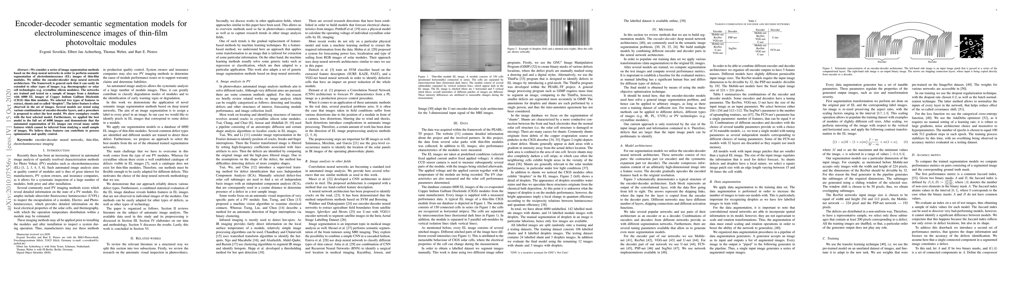 This paper explores encoder-decoder neural network models for semantic segmentation of electroluminescence images of thin-film photovoltaic modules, specifically focusing on identifying shunts and "droplets." The best model is applied to a dataset of 6000 images, revealing subtle features that could enhance process optimization and quality control.