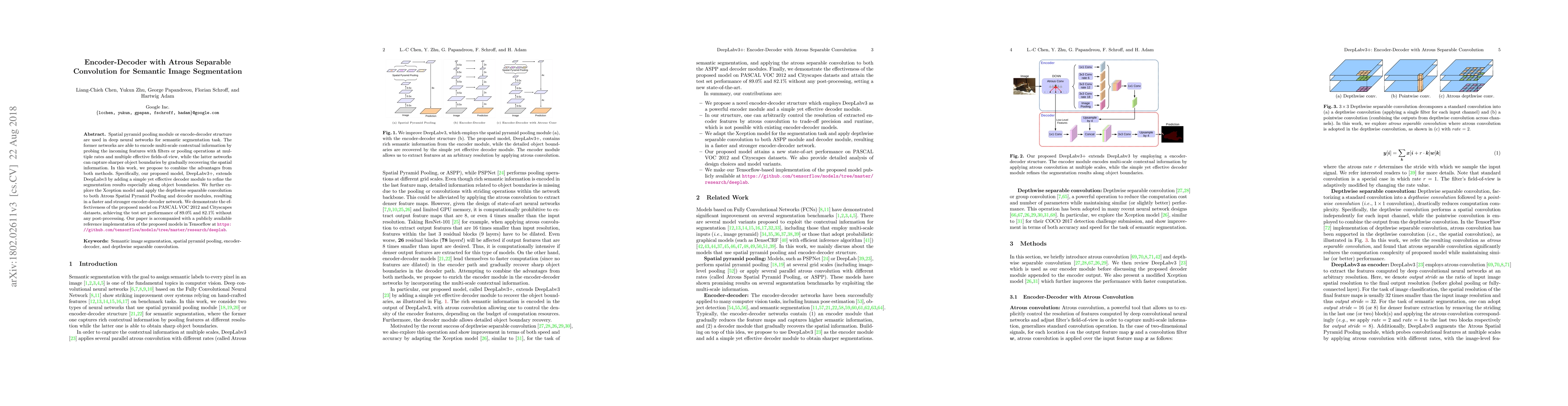 This paper proposes DeepLabv3+ for semantic image segmentation, combining spatial pyramid pooling with an encoder-decoder structure to capture multi-scale context and sharp object boundaries. It employs Atrous separable convolution to enhance efficiency and performance, achieving 89.0% and 82.1% accuracy on PASCAL VOC 2012 and Cityscapes datasets respectively.