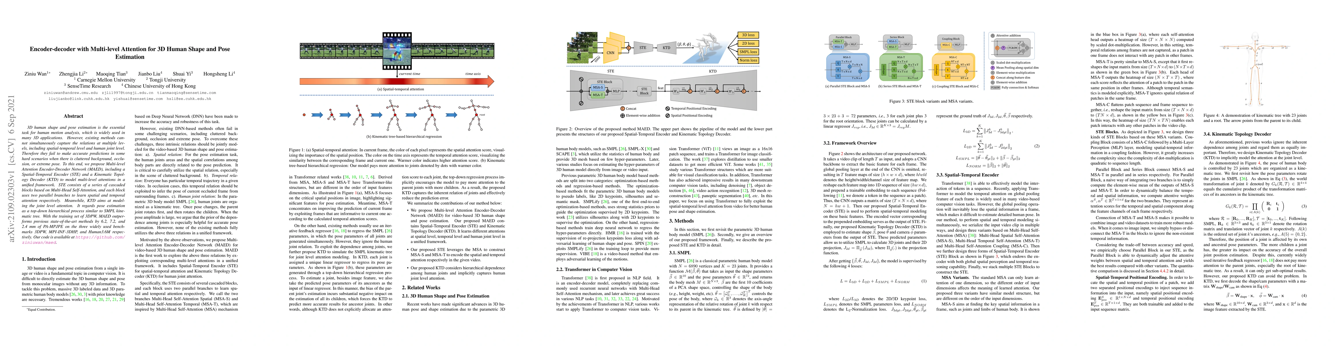 This paper proposes a Multi-level Attention Encoder-Decoder Network (MAED) for 3D human shape and pose estimation, featuring a Spatial-Temporal Encoder (STE) and a Kinematic Topology Decoder (KTD) to capture multi-level attentions. The MAED model outperforms previous methods on three benchmarks, achieving significant improvements in accuracy.