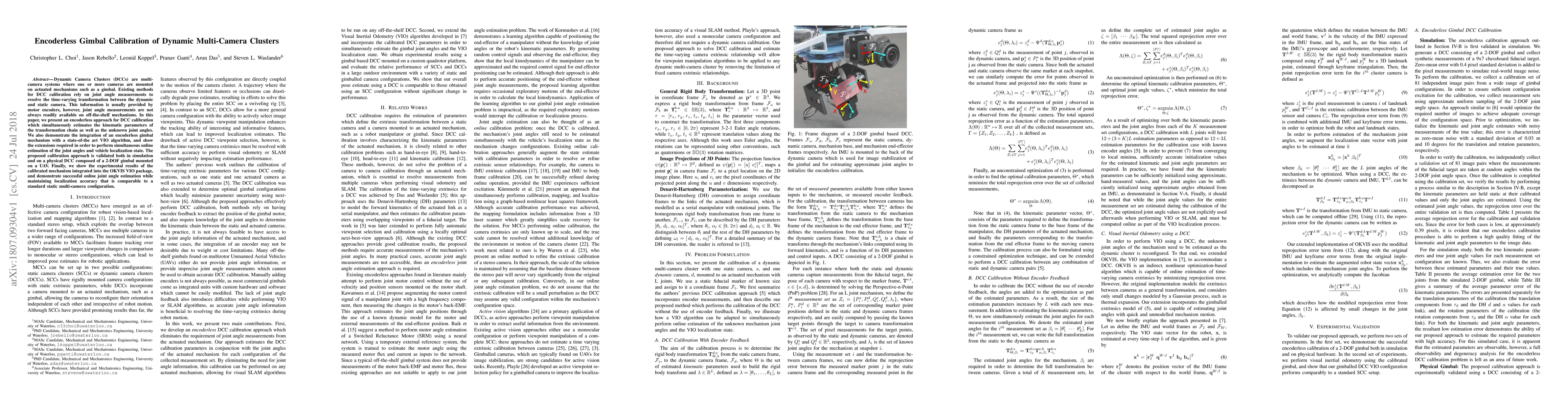 Dynamic Camera Clusters (DCCs) are multi-camera systems where one or more cameras are mounted on actuated mechanisms such as a gimbal. Existing methods for DCC calibration rely on joint angle measurements to resolve the time-varying transformation between the dynamic and static camera. This information is usually provided by motor encoders, however, joint angle measurements are not always readily available on off-the-shelf mechanisms. In this paper, we present an encoderless approach for DCC calibration which simultaneously estimates the kinematic parameters of the transformation chain as well as the unknown joint angles. We also demonstrate the integration of an encoderless gimbal mechanism with a state-of-the art VIO algorithm, and show the extensions required in order to perform simultaneous online estimation of the joint angles and vehicle localization state. The proposed calibration approach is validated both in simulation and on a physical DCC composed of a 2-DOF gimbal mounted on a UAV. Finally, we show the experimental results of the calibrated mechanism integrated into the OKVIS VIO package, and demonstrate successful online joint angle estimation while maintaining localization accuracy that is comparable to a standard static multi-camera configuration.