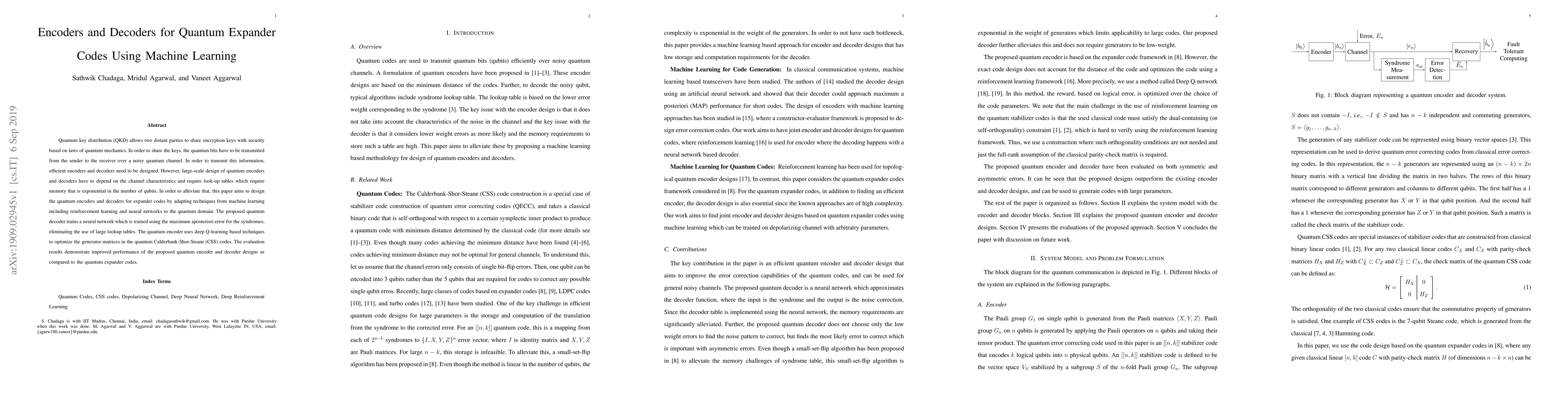 Quantum key distribution (QKD) allows two distant parties to share encryption keys with security based on laws of quantum mechanics. In order to share the keys, the quantum bits have to be transmitted from the sender to the receiver over a noisy quantum channel. In order to transmit this information, efficient encoders and decoders need to be designed. However, large-scale design of quantum encoders and decoders have to depend on the channel characteristics and require look-up tables which require memory that is exponential in the number of qubits. In order to alleviate that, this paper aims to design the quantum encoders and decoders for expander codes by adapting techniques from machine learning including reinforcement learning and neural networks to the quantum domain. The proposed quantum decoder trains a neural network which is trained using the maximum aposteriori error for the syndromes, eliminating the use of large lookup tables. The quantum encoder uses deep Q-learning based techniques to optimize the generator matrices in the quantum Calderbank-Shor-Steane (CSS) codes. The evaluation results demonstrate improved performance of the proposed quantum encoder and decoder designs as compared to the quantum expander codes.