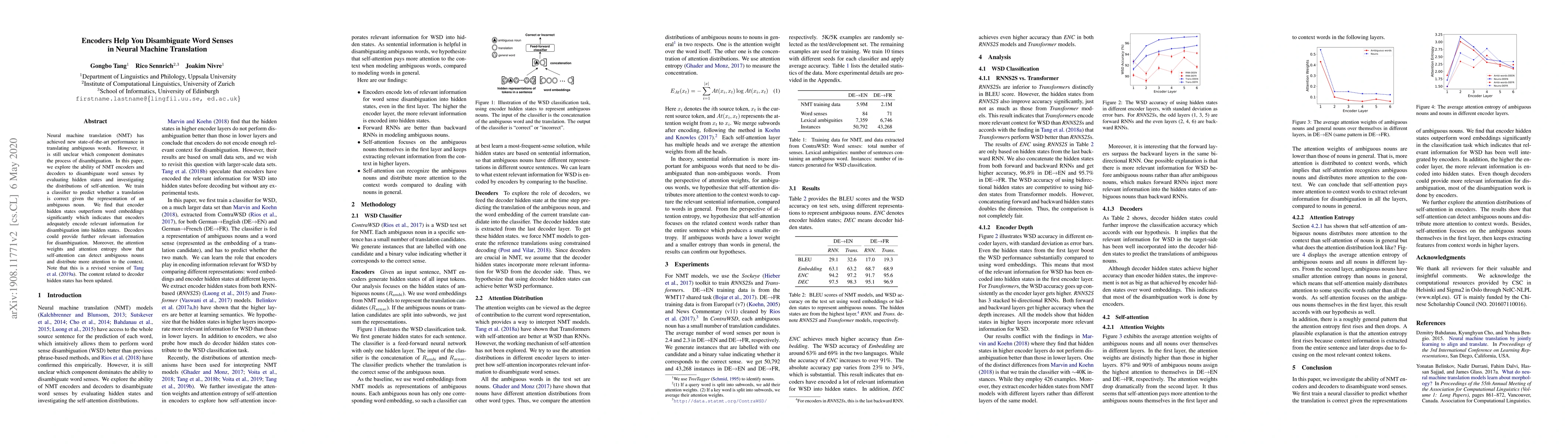 This paper investigates how NMT encoders and decoders contribute to disambiguating ambiguous word senses, finding that encoder hidden states are more effective than word embeddings. The study reveals that self-attention mechanisms in the encoders can detect ambiguous nouns and distribute more contextual attention, while decoders also provide additional relevant information for disambiguation.
