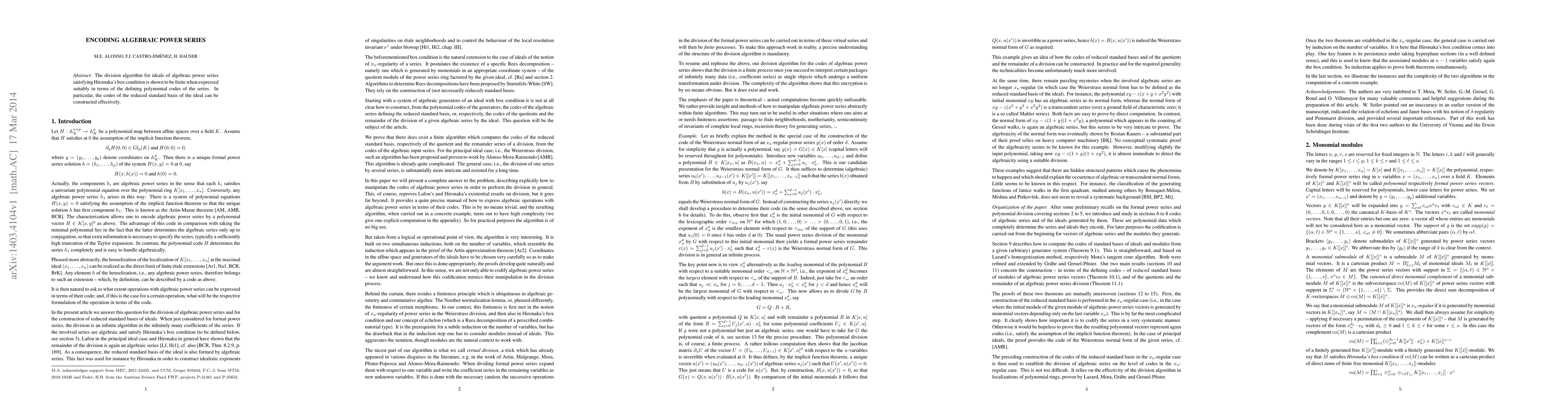 This paper proposes a method to encode algebraic power series using a vector of polynomials, enabling manipulation through their code, including performing Weierstrass and Grauert-Hironaka-Galligo division algorithms to compute quotients and remainders.