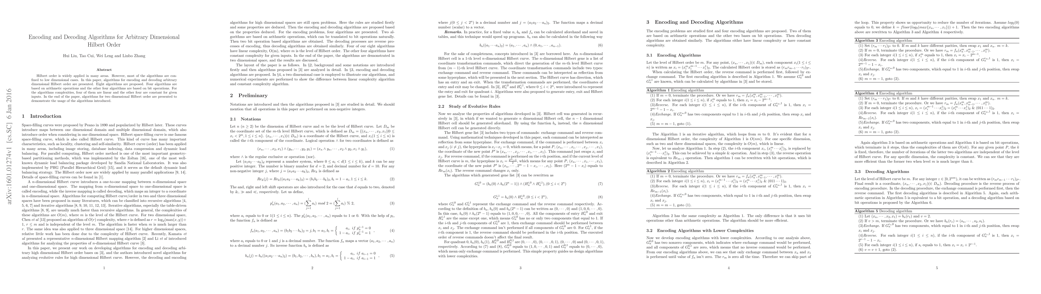 Researchers developed algorithms for encoding and decoding arbitrary dimensional Hilbert order, expanding its applications to higher dimensions. Eight new algorithms were proposed, offering improved efficiency in various complex cases.