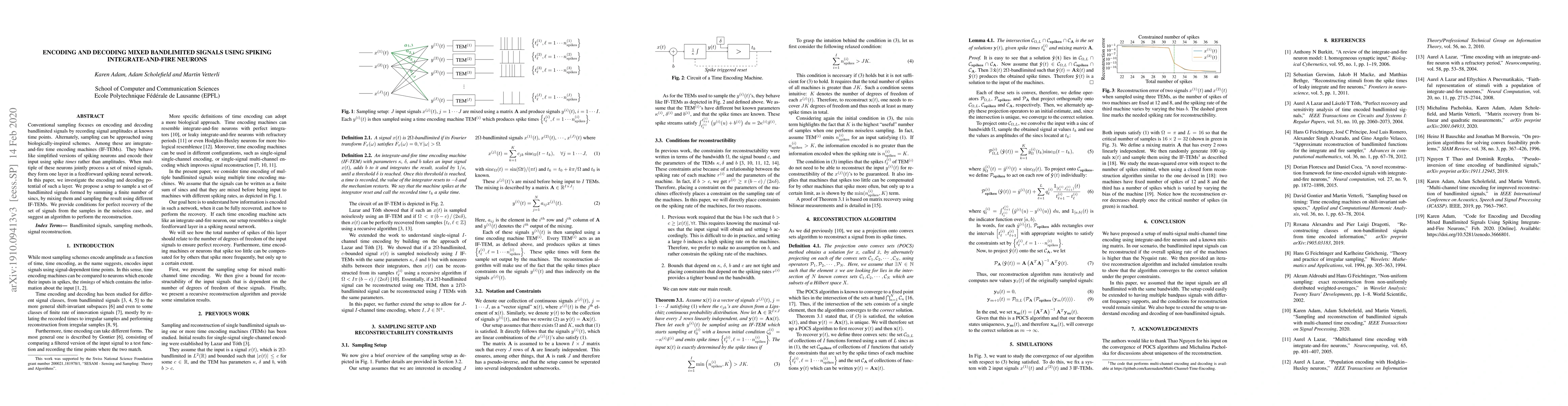 Conventional sampling focuses on encoding and decoding bandlimited signals by recording signal amplitudes at known time points. Alternately, sampling can be approached using biologically-inspired schemes. Among these are integrate-and-fire time encoding machines (IF-TEMs). They behave like simplified versions of spiking neurons and encode their input using spike times rather than amplitudes. Moreover, when multiple of these neurons jointly process a set of mixed signals, they form one layer in a feedforward spiking neural network. In this paper, we investigate the encoding and decoding potential of such a layer. We propose a setup to sample a set of bandlimited signals, by mixing them and sampling the result using different IF-TEMs. We provide conditions for perfect recovery of the set of signals from the samples in the noiseless case, and suggest an algorithm to perform the reconstruction.