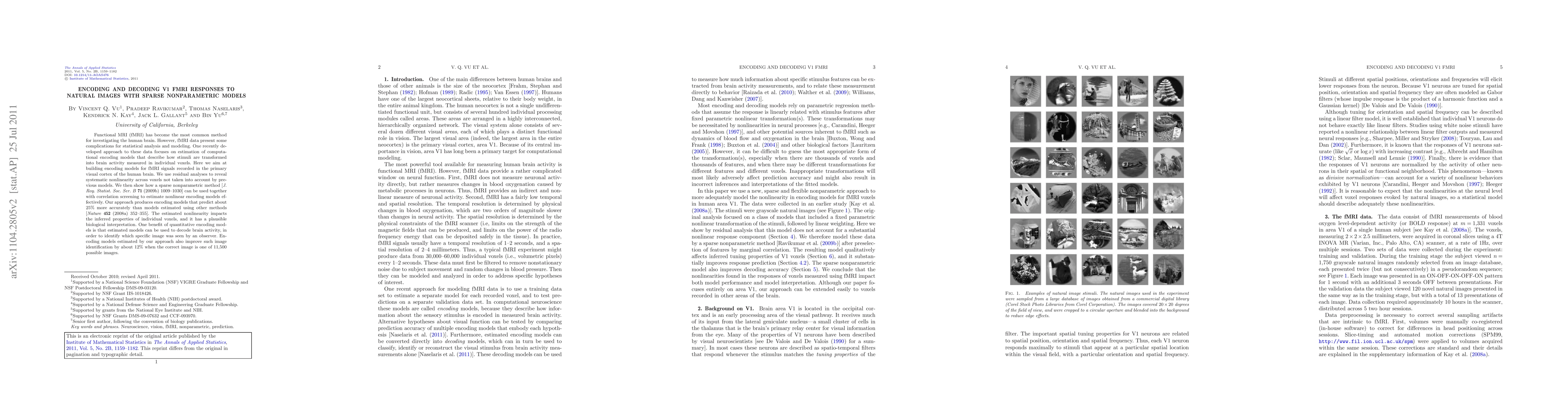 This paper develops sparse nonparametric models for encoding and decoding fMRI responses in the primary visual cortex, revealing systematic nonlinearities not captured by previous models. The proposed method improves prediction accuracy by 25% and decoding performance by 12% compared to other techniques.