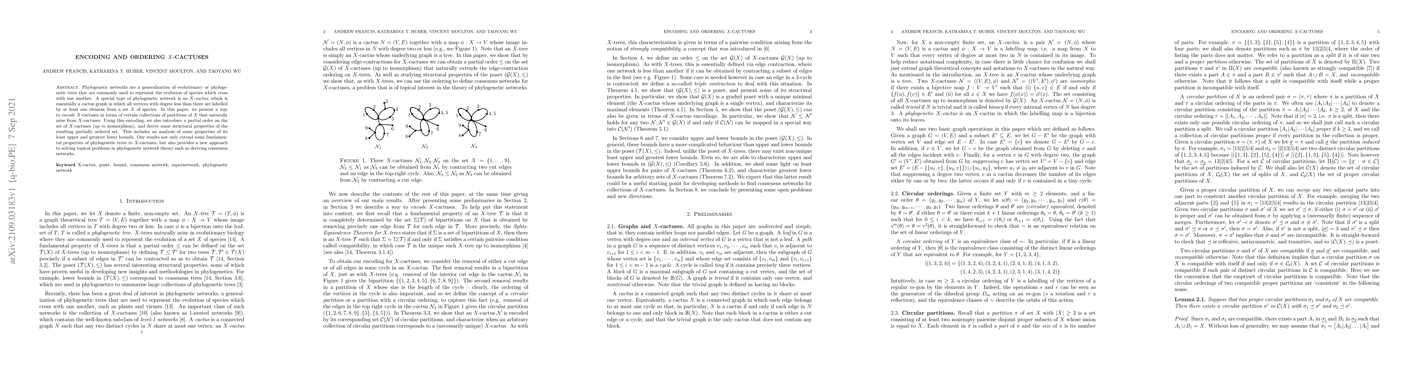 Phylogenetic networks are a generalization of evolutionary or phylogenetic trees that are commonly used to represent the evolution of species which cross with one another. A special type of phylogenetic network is an {\em $X$-cactus}, which is essentially a cactus graph in which all vertices with degree less than three are labelled by at least one element from a set $X$ of species. In this paper, we present a way to {\em encode} $X$-cactuses in terms of certain collections of partitions of $X$ that naturally arise from $X$-cactuses. Using this encoding, we also introduce a partial order on the set of $X$-cactuses (up to isomorphism), and derive some structural properties of the resulting partially ordered set. This includes an analysis of some properties of its least upper and greatest lower bounds. Our results not only extend some fundamental properties of phylogenetic trees to $X$-cactuses, but also provides a new approach to solving topical problems in phylogenetic network theory such as deriving consensus networks.