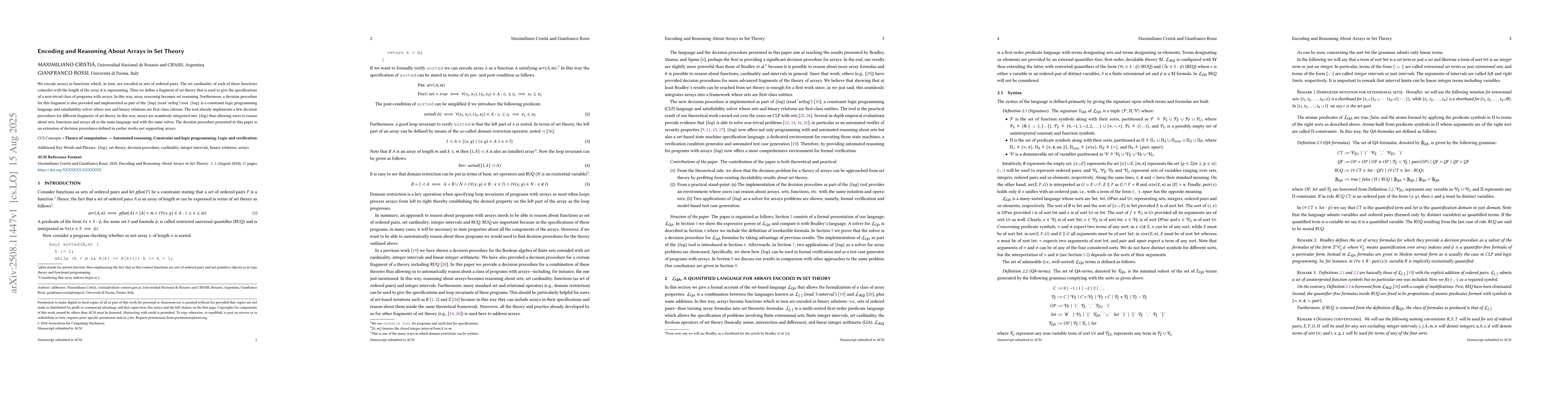 We encode arrays as functions which, in turn, are encoded as sets of ordered pairs. The set cardinality of each of these functions coincides with the length of the array it is representing. Then we define a fragment of set theory that is used to give the specifications of a non-trivial class of programs with arrays. In this way, array reasoning becomes set reasoning. Furthermore, a decision procedure for this fragment is also provided and implemented as part of the {log} (read 'setlog') tool. {log} is a constraint logic programming language and satisfiability solver where sets and binary relations are first-class citizens. The tool already implements a few decision procedures for different fragments of set theory. In this way, arrays are seamlessly integrated into {log} thus allowing users to reason about sets, functions and arrays all in the same language and with the same solver. The decision procedure presented in this paper is an extension of decision procedures defined in earlier works not supporting arrays.