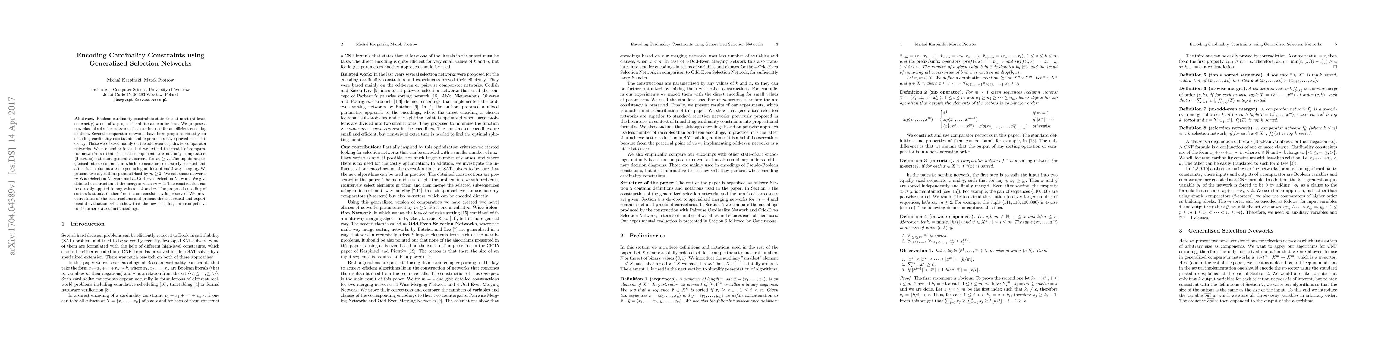 This paper introduces a new class of generalized selection networks called $m$-Wise Selection Network and $m$-Odd-Even Selection Network for encoding cardinality constraints. The networks use $m$-sorters to recursively select and merge columns, proving to be competitive with other state-of-the-art encodings through theoretical and experimental evaluations.