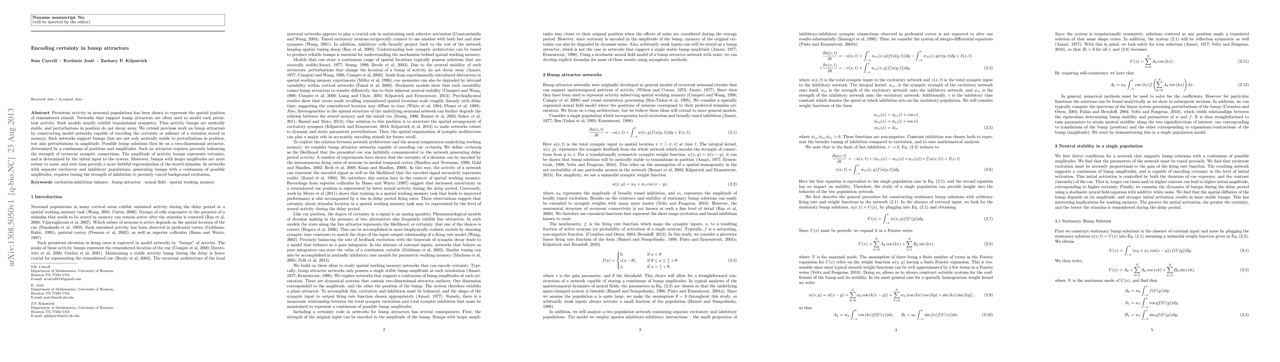 Persistent activity in neuronal populations has been shown to represent the spatial position of remembered stimuli. Networks that support bump attractors are often used to model such persistent activity. Such models usually exhibit translational symmetry. Thus activity bumps are neutrally stable, and perturbations in position do not decay away. We extend previous work on bump attractors by constructing model networks capable of encoding the certainty or salience of a stimulus stored in memory. Such networks support bumps that are not only neutrally stable to perturbations in position, but also perturbations in amplitude. Possible bump solutions then lie on a two-dimensional attractor, determined by a continuum of positions and amplitudes. Such an attractor requires precisely balancing the strength of recurrent synaptic connections. The amplitude of activity bumps represents certainty, and is determined by the initial input to the system. Moreover, bumps with larger amplitudes are more robust to noise, and over time provide a more faithful representation of the stored stimulus. In networks with separate excitatory and inhibitory populations, generating bumps with a continuum of possible amplitudes, requires tuning the strength of inhibition to precisely cancel background excitation.