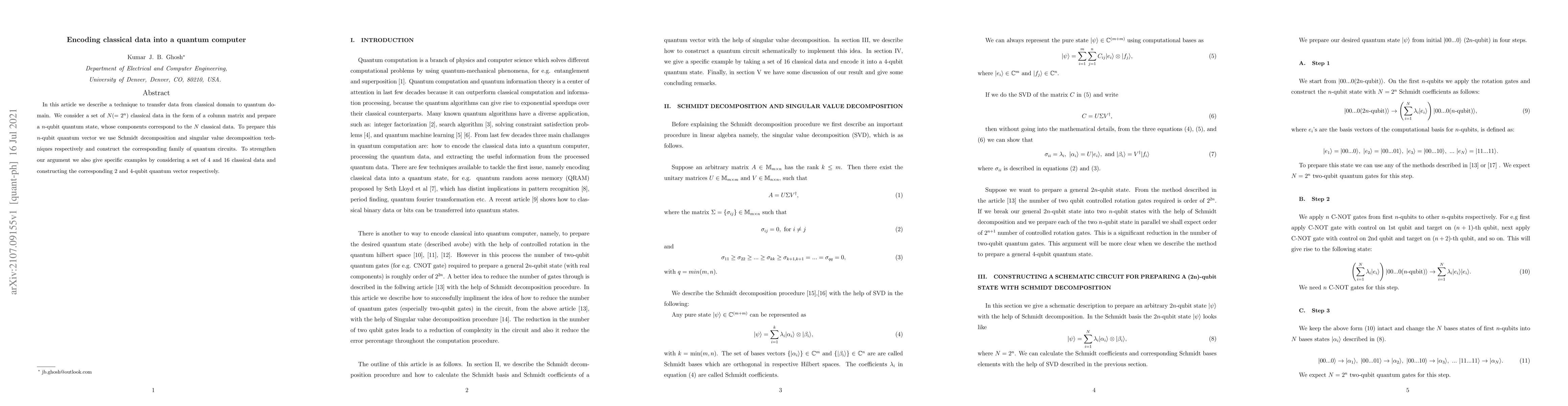 This research introduces a method to convert classical data into quantum states using Schmidt and singular value decomposition techniques. It provides examples with 4 and 16 classical data points, illustrating the creation of 2 and 4-qubit quantum vectors respectively.