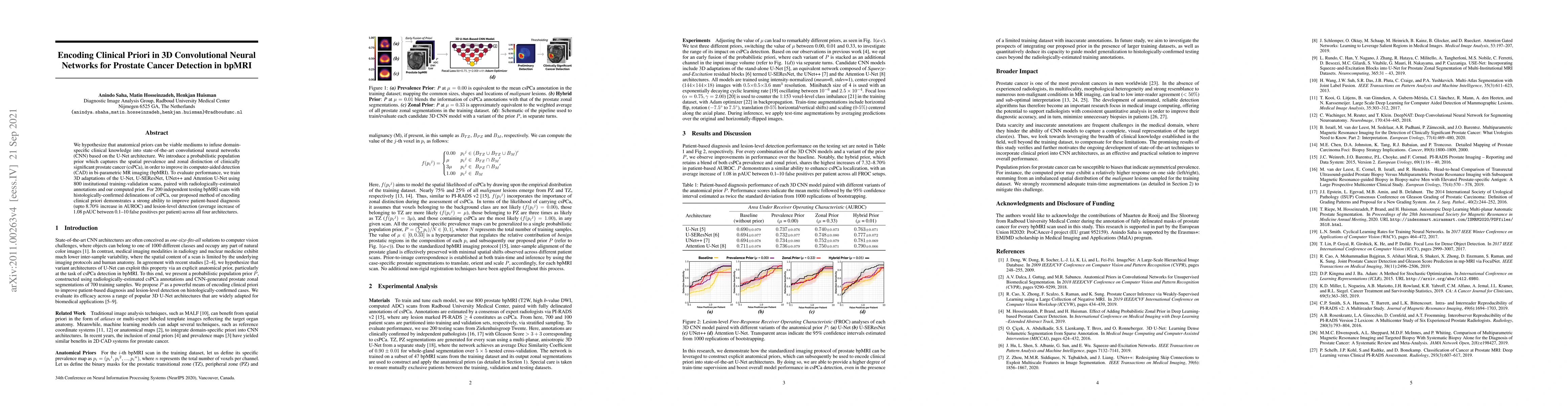 This paper proposes encoding anatomical priors into 3D convolutional neural networks to enhance prostate cancer detection in bi-parametric MRI. The method shows an up to 8.70% increase in AUROC and a 1.08 pAUC improvement in lesion detection across various CNN architectures.