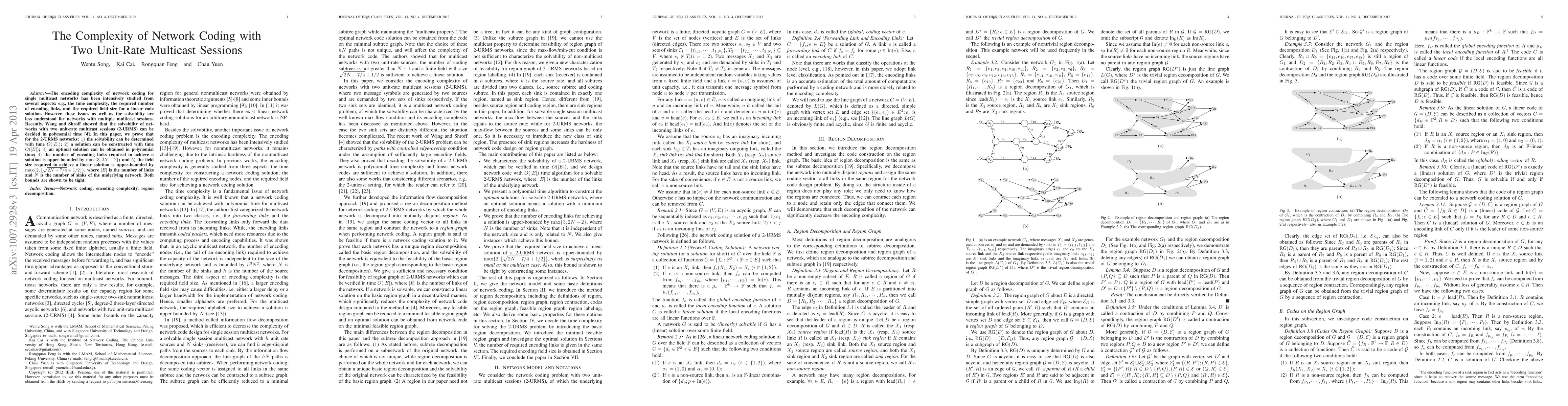 The encoding complexity of network coding for single multicast networks has been intensively studied from several aspects: e.g., the time complexity, the required number of encoding links, and the required field size for a linear code solution. However, these issues as well as the solvability are less understood for networks with multiple multicast sessions. Recently, Wang and Shroff showed that the solvability of networks with two unit-rate multicast sessions (2-URMS) can be decided in polynomial time. In this paper, we prove that for the 2-URMS networks: $1)$ the solvability can be determined with time $O(|E|)$; $2)$ a solution can be constructed with time $O(|E|)$; $3)$ an optimal solution can be obtained in polynomial time; $4)$ the number of encoding links required to achieve a solution is upper-bounded by $\max\{3,2N-2\}$; and $5)$ the field size required to achieve a linear solution is upper-bounded by $\max\{2,\lfloor\sqrt{2N-7/4}+1/2\rfloor\}$, where $|E|$ is the number of links and $N$ is the number of sinks of the underlying network. Both bounds are shown to be tight.