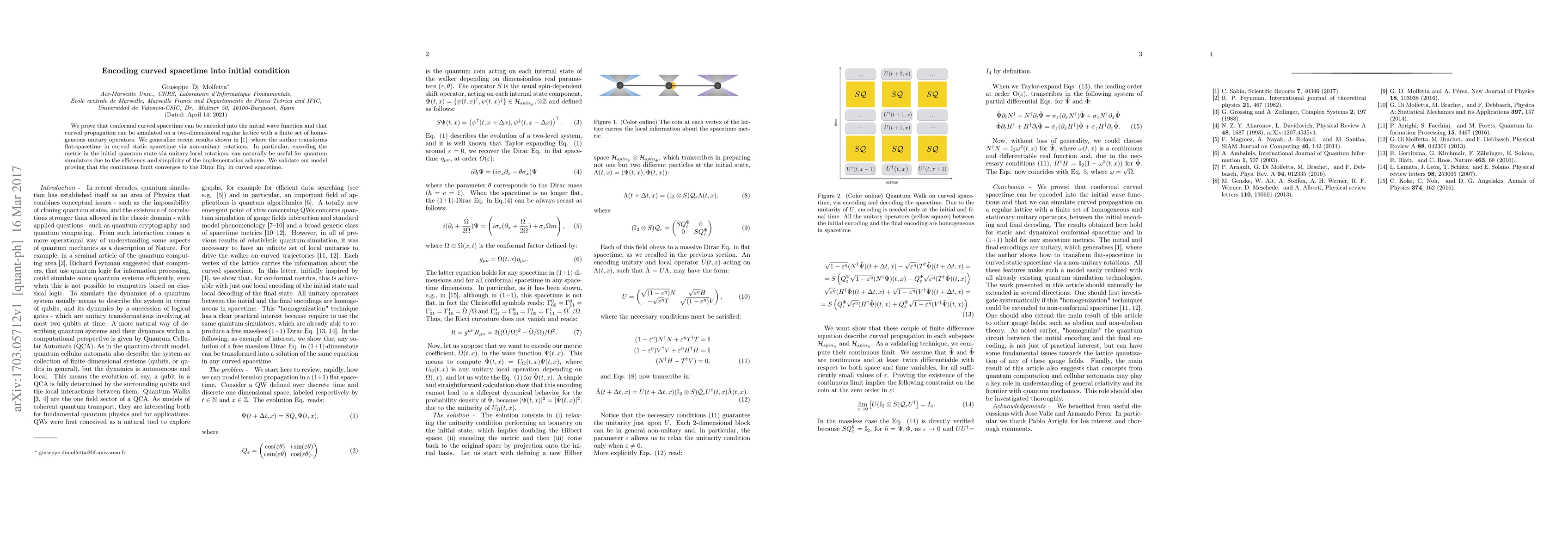 We prove that conformal curved spacetime can be encoded into the initial wave function and that curved propagation can be simulated on a two-dimensional regular lattice with a finite set of homogeneous unitary operators. We generalize recent results shown in [1], where the author transforms flat-spacetime in curved static spacetime via non-unitary rotations. In particular, encoding the metric in the initial quantum state via unitary local rotations, can naturally be useful for quantum simulators due to the efficiency and simplicity of the implementation scheme. We validate our model proving that the continuous limit converges to the Dirac Eq. in curved spacetime.